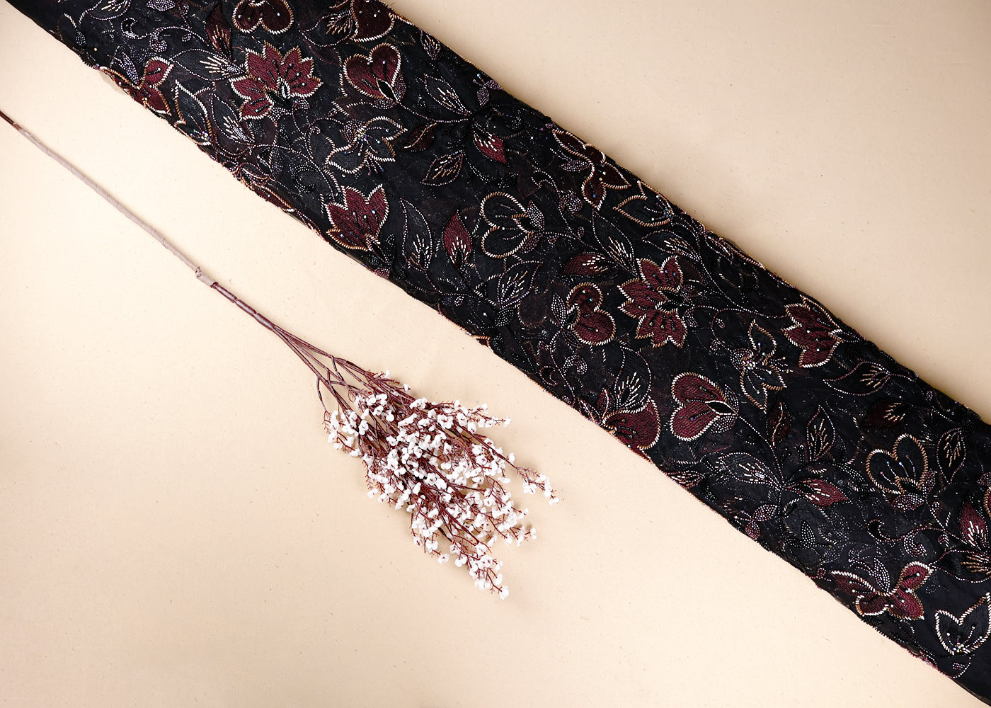Black net with floral pattern using beads with beads and glitter allover on fabric