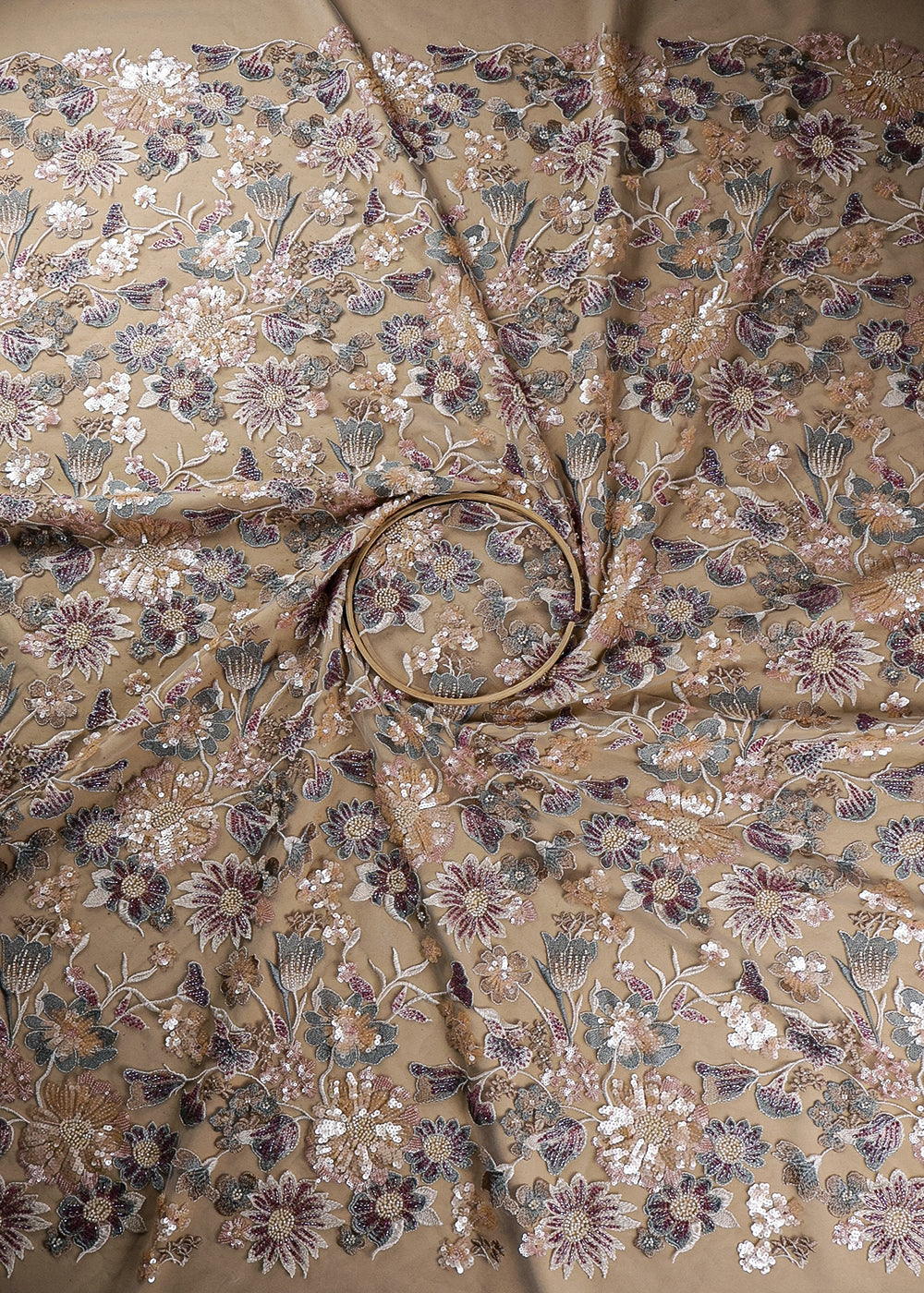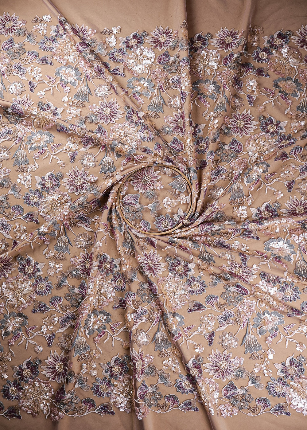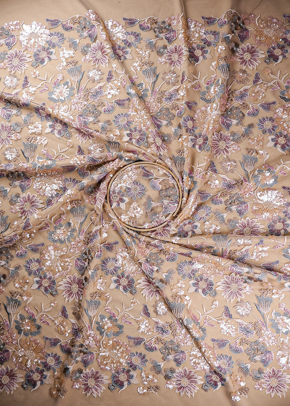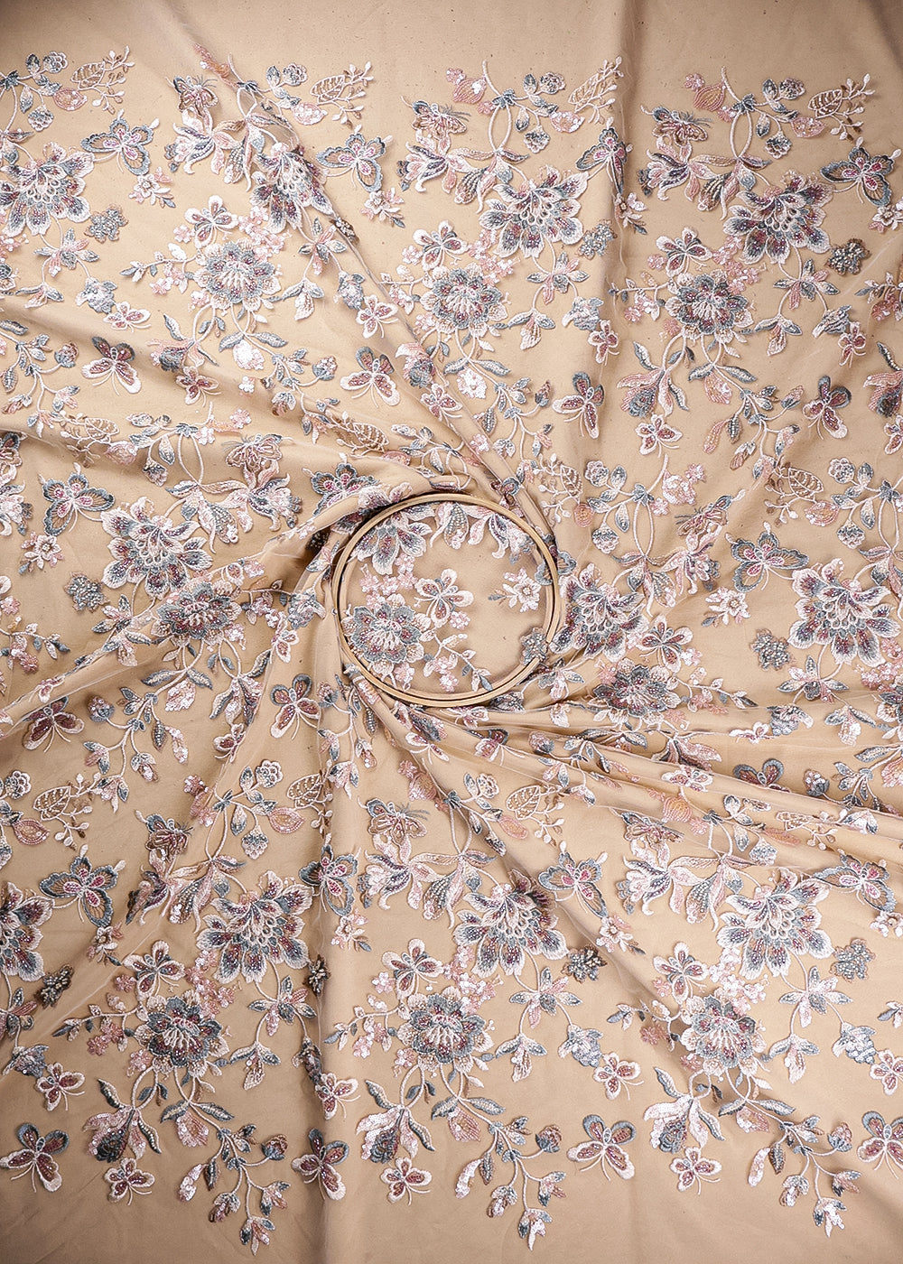 Light Peach Net Adorned with Beads, Pearls, and Sequins