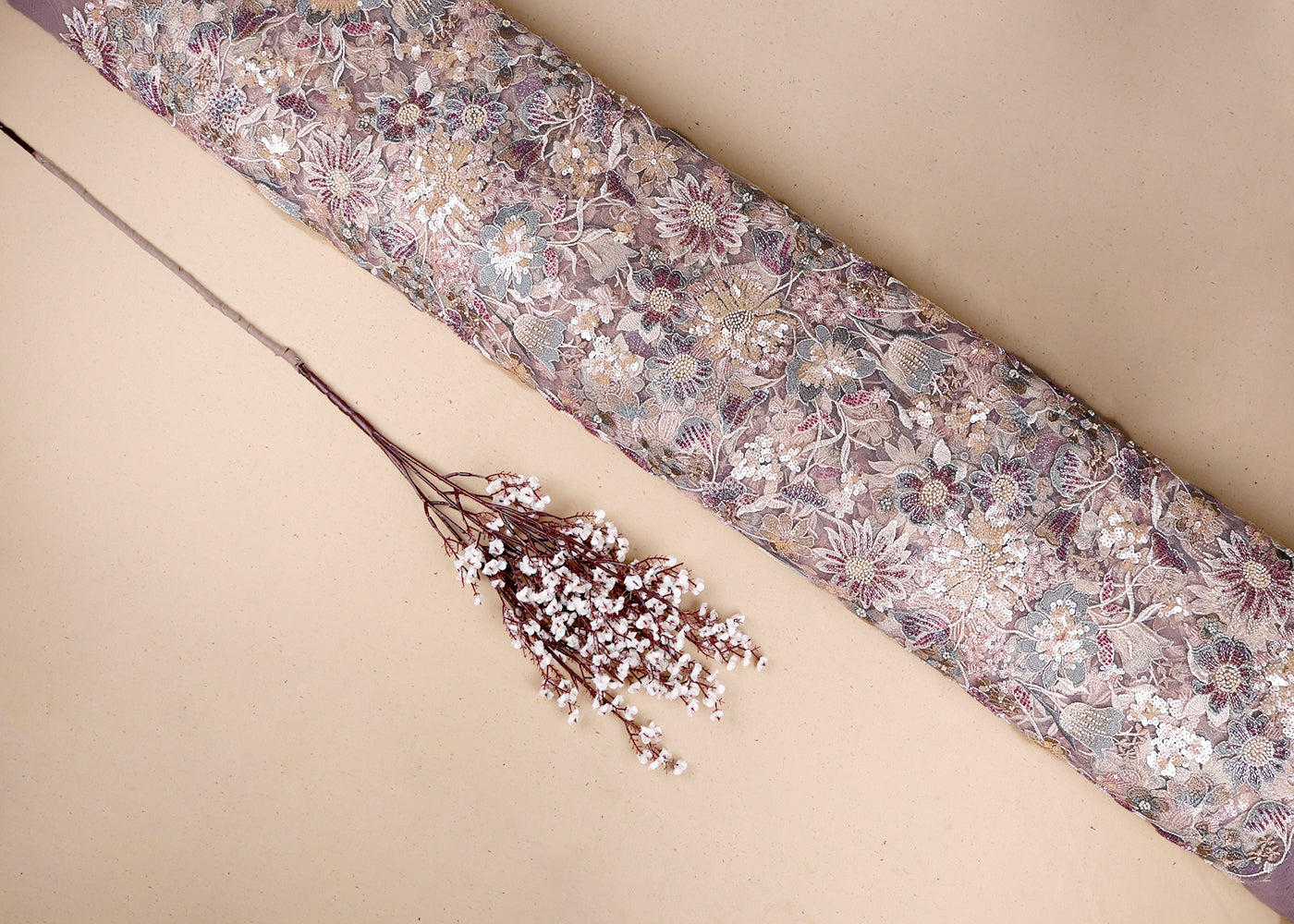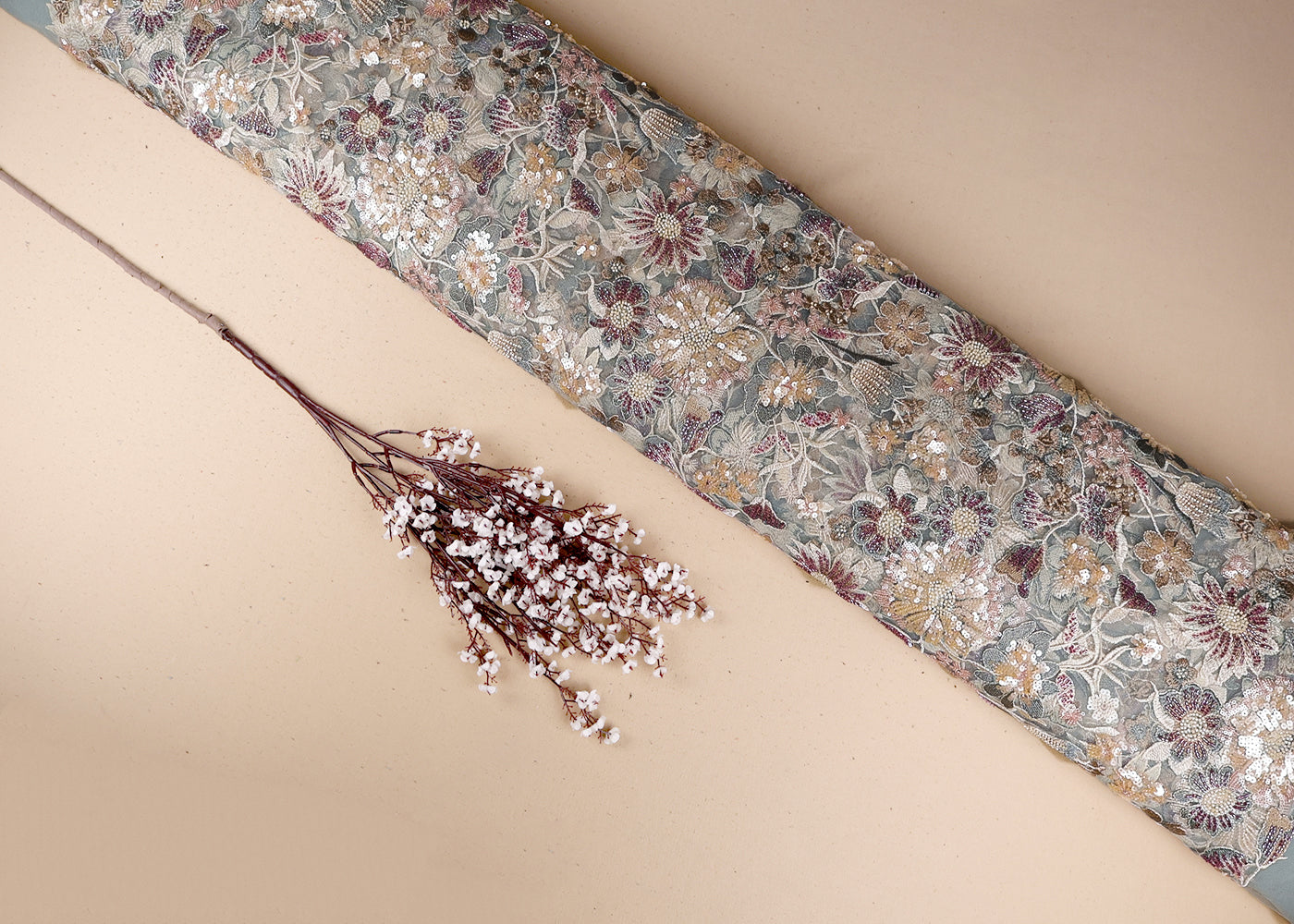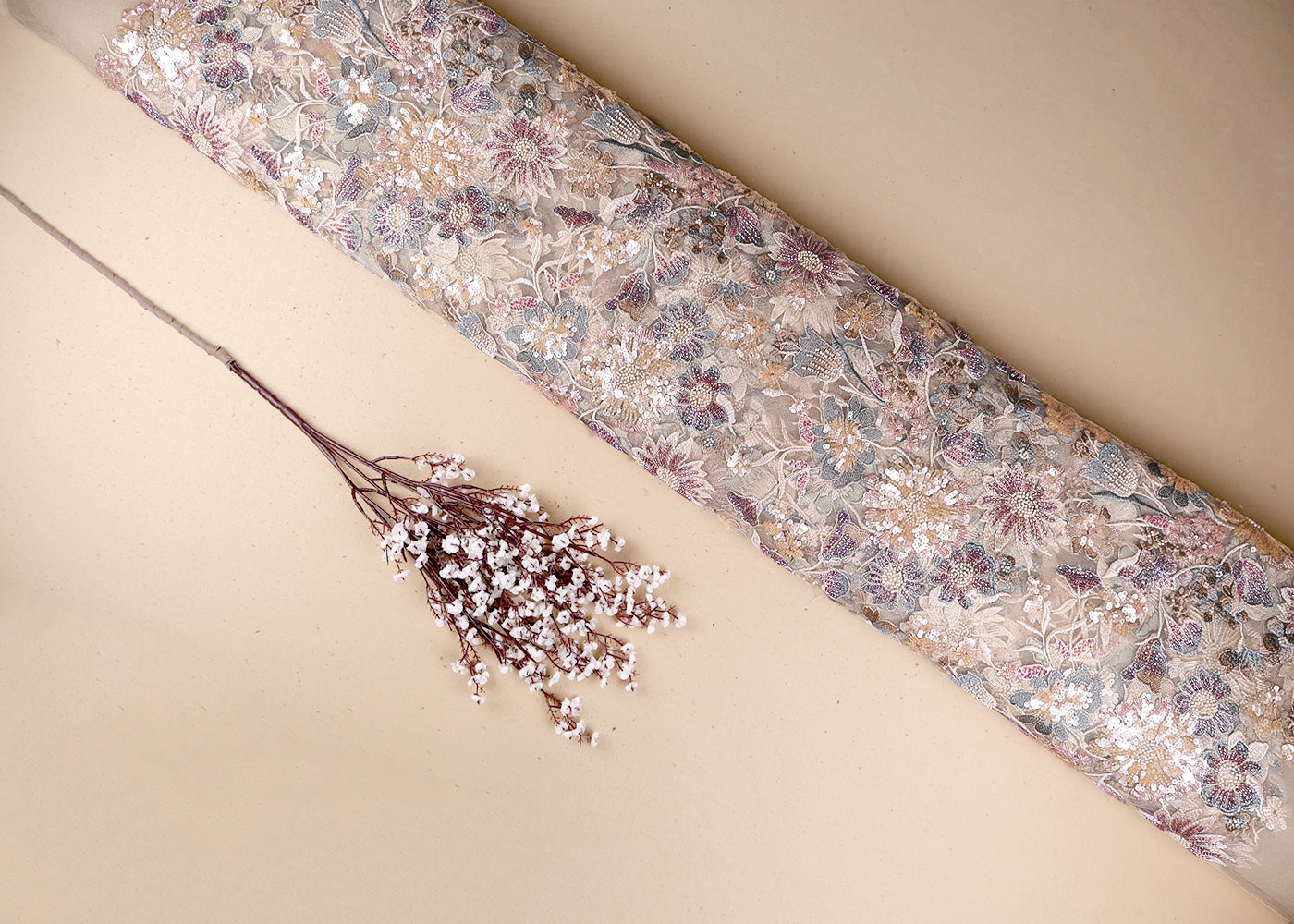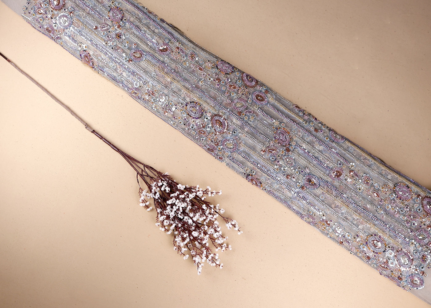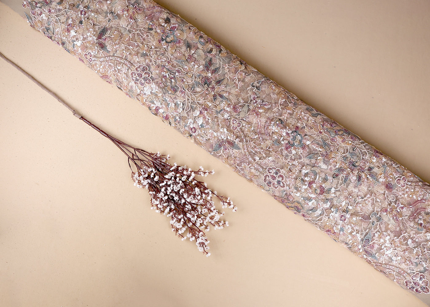 Light Peach Net Adorned with Beads, Pearls, and Sequins