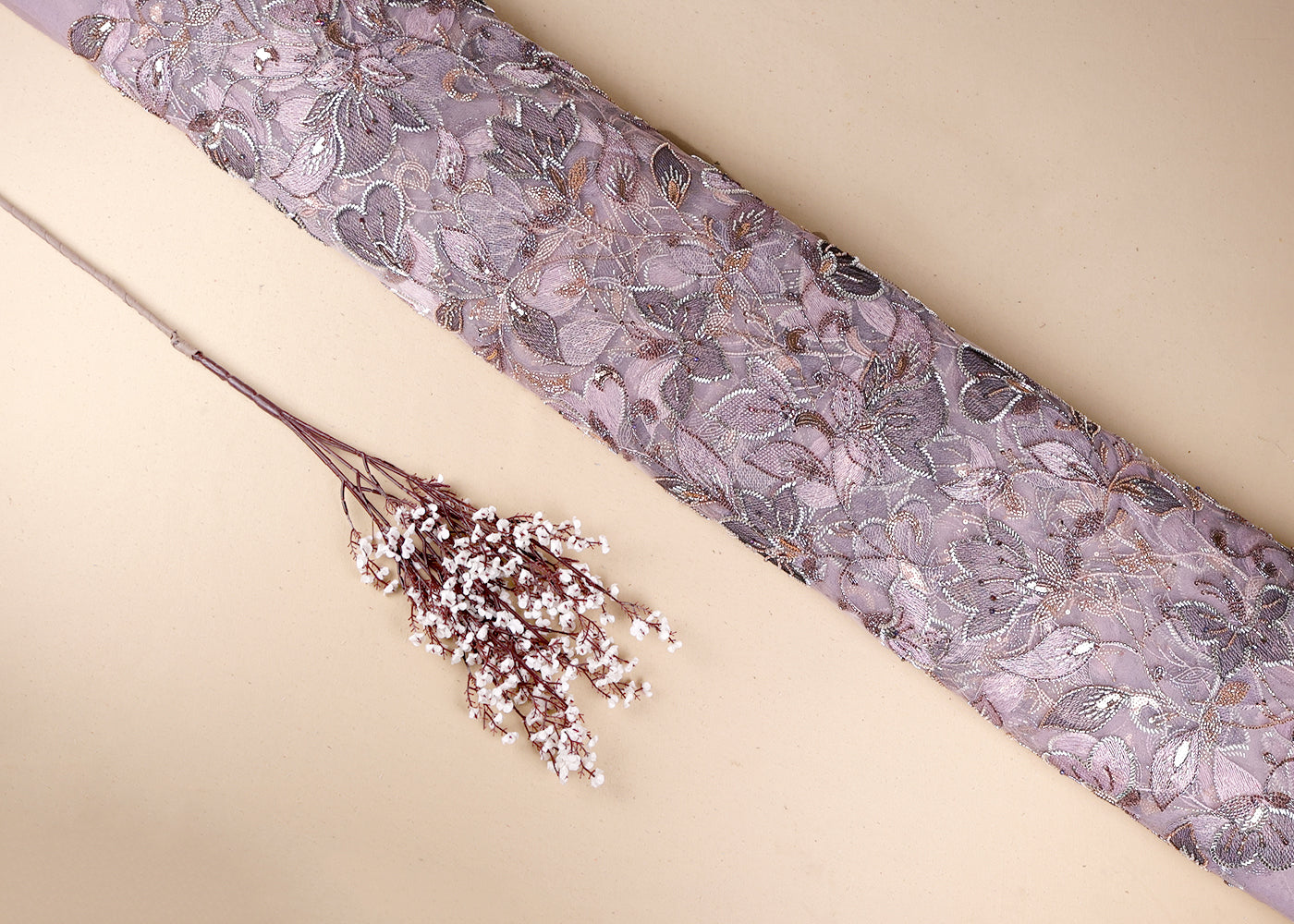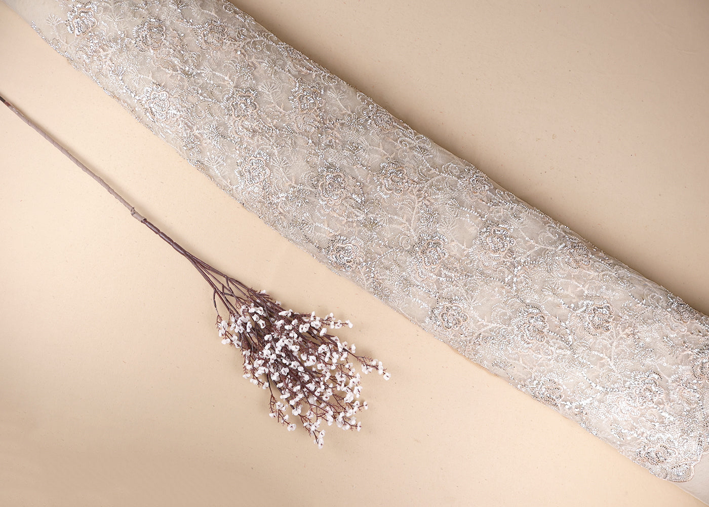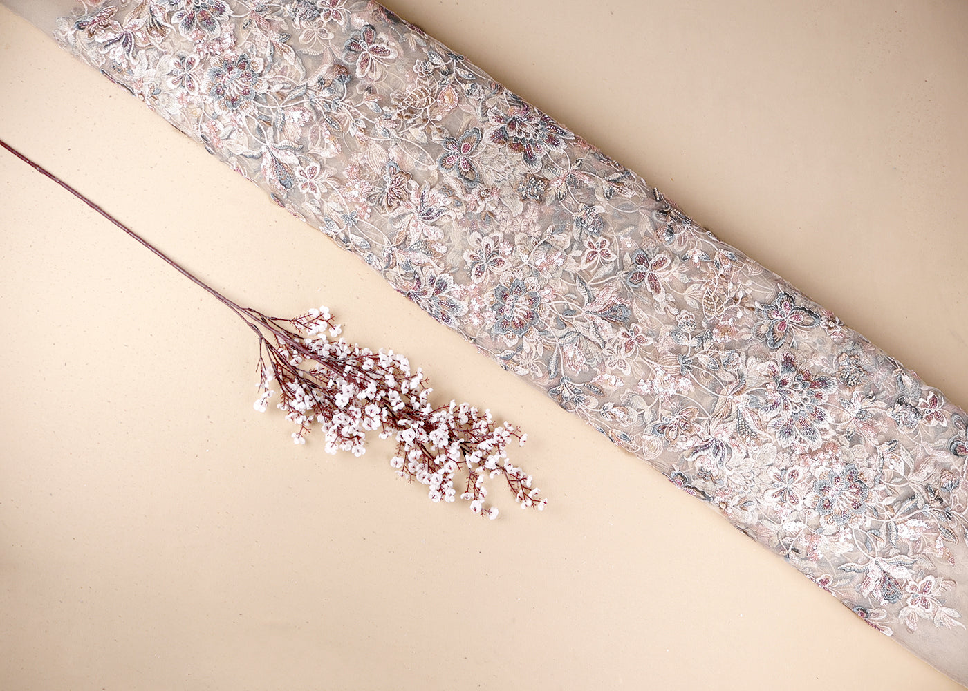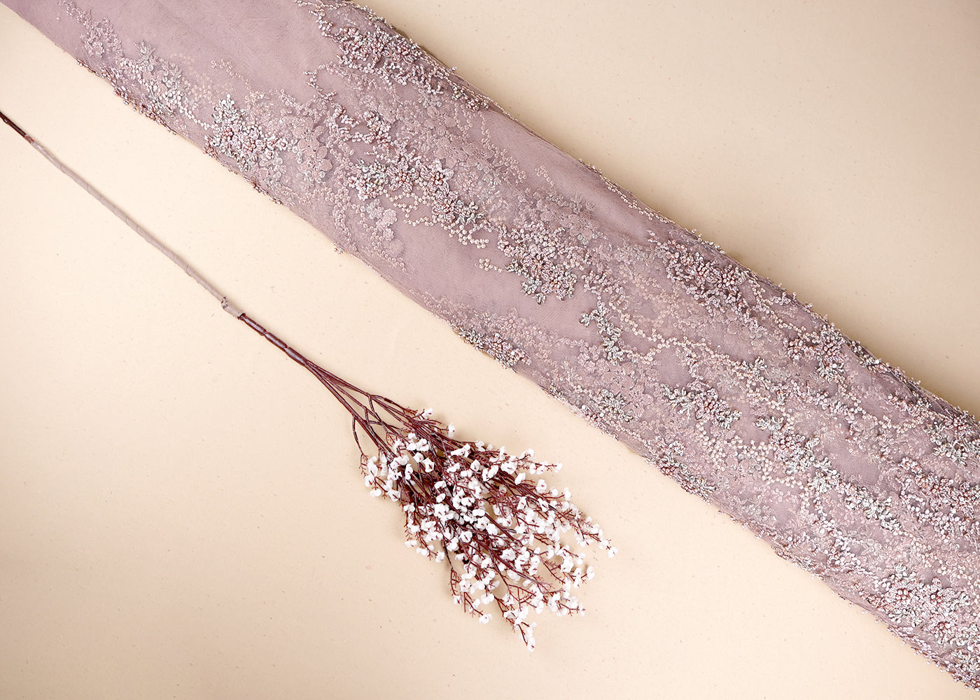 Light Peach Net Adorned with Beads, Pearls, and Sequins