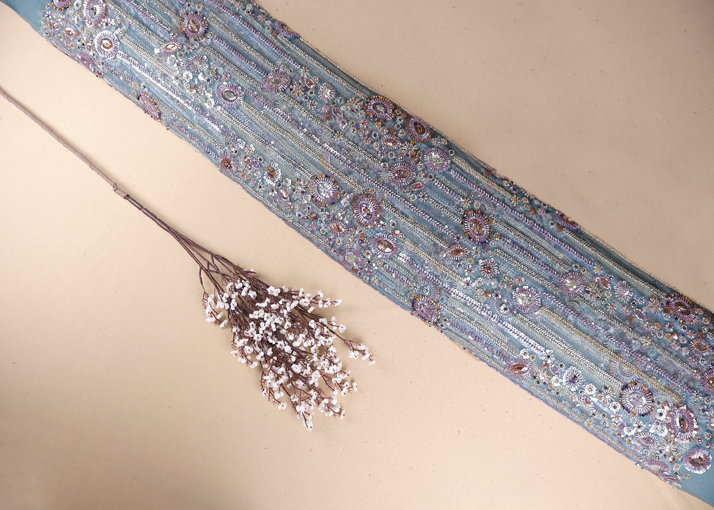 Powder Blue Imported Net Fabric With All Over Bead And Sequins Work 19412
