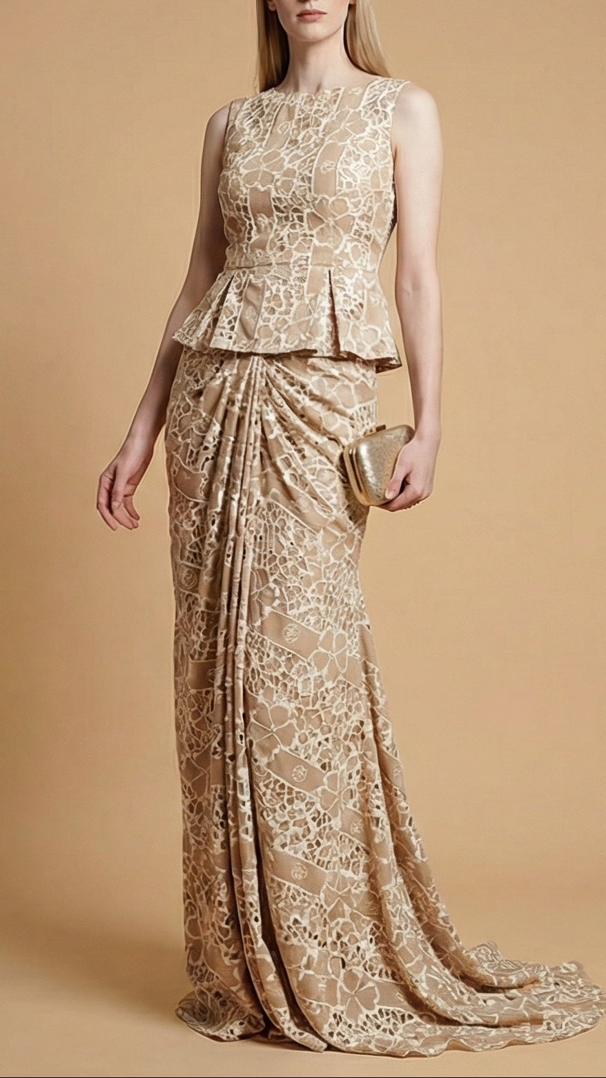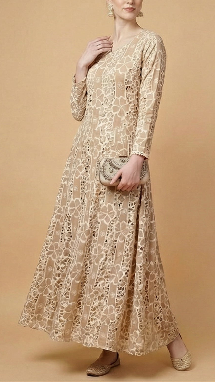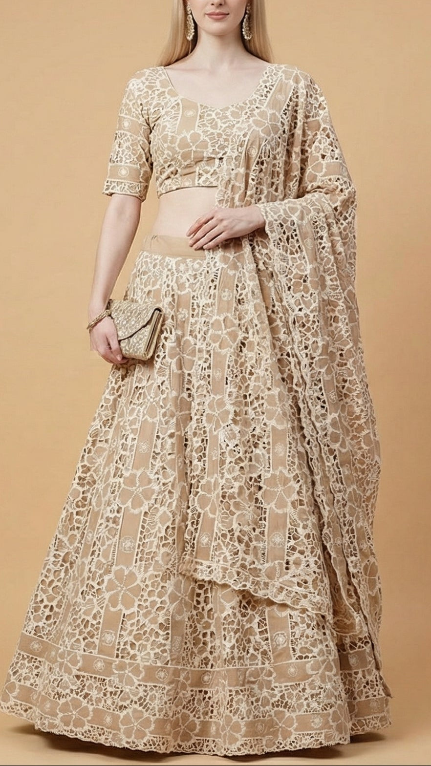 | Fabric Name | Beige Imported Crepe Fabric With All Over Cutwork |