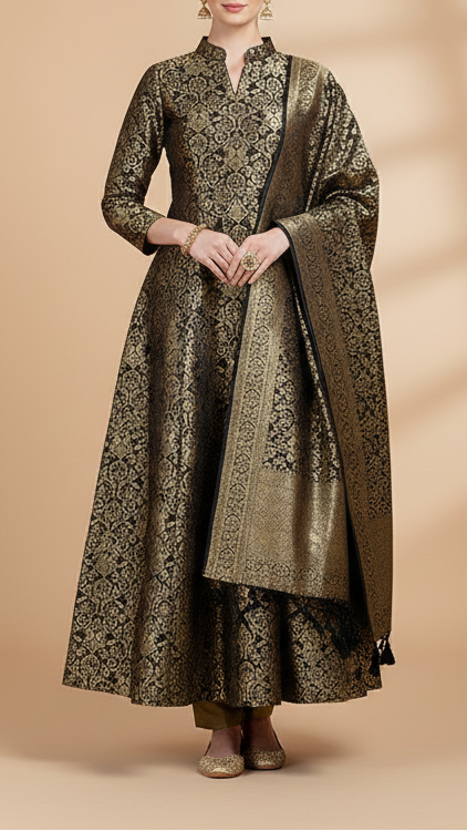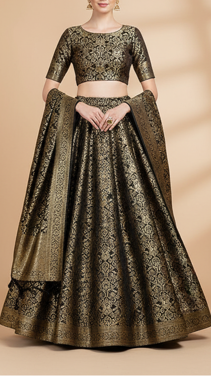 | Fabric Name | Black Banarasi Brocade Fabric With All Over Golden Zari Handloom |