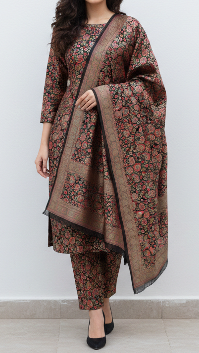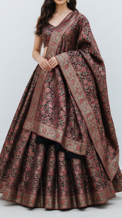 | Fabric Name | Black Banarasi Brocade Fabric With All Over Thread And Zari Handloom |