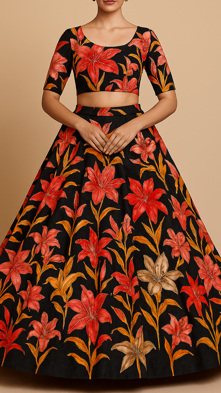 | Fabric Name | Black Crepe Fabric With All Over Floral Print And Katdana Work |