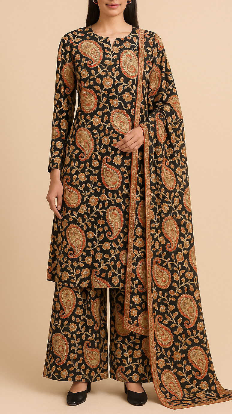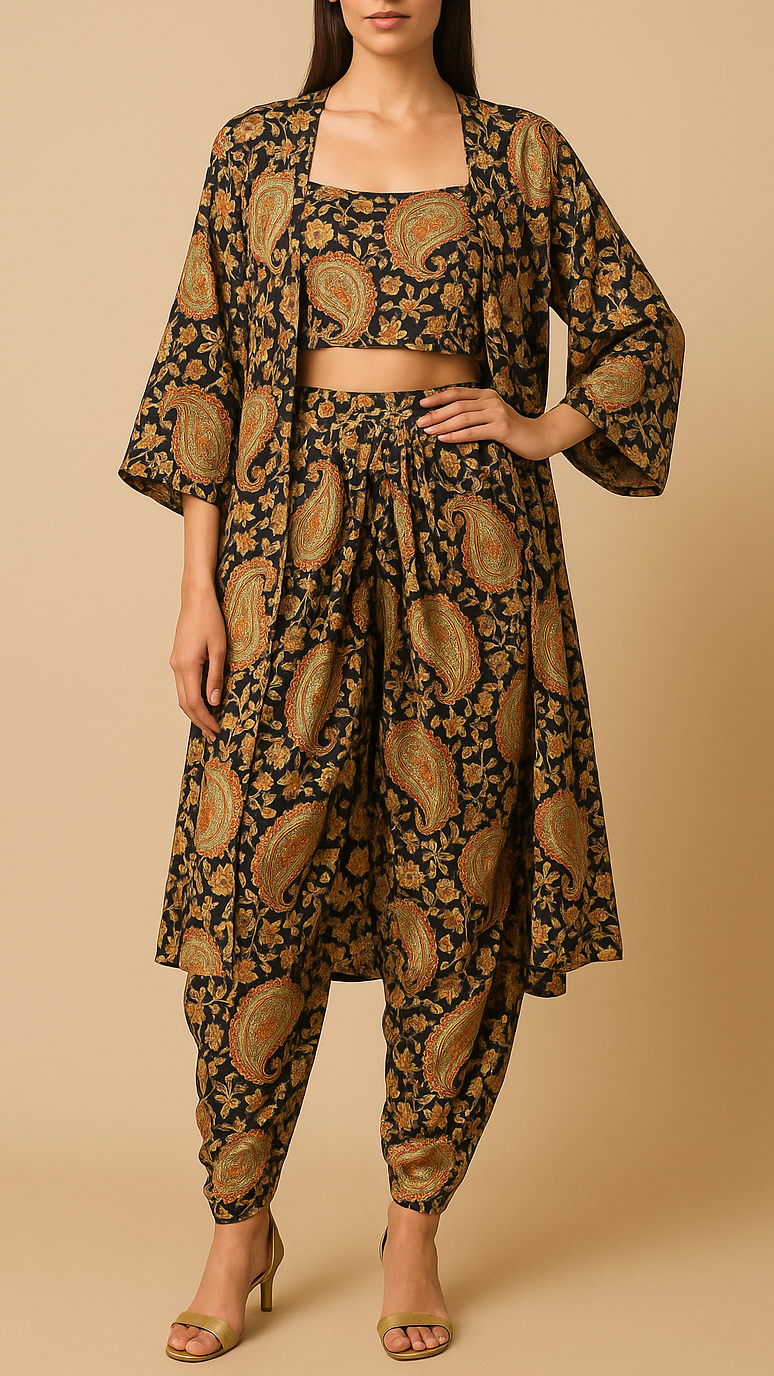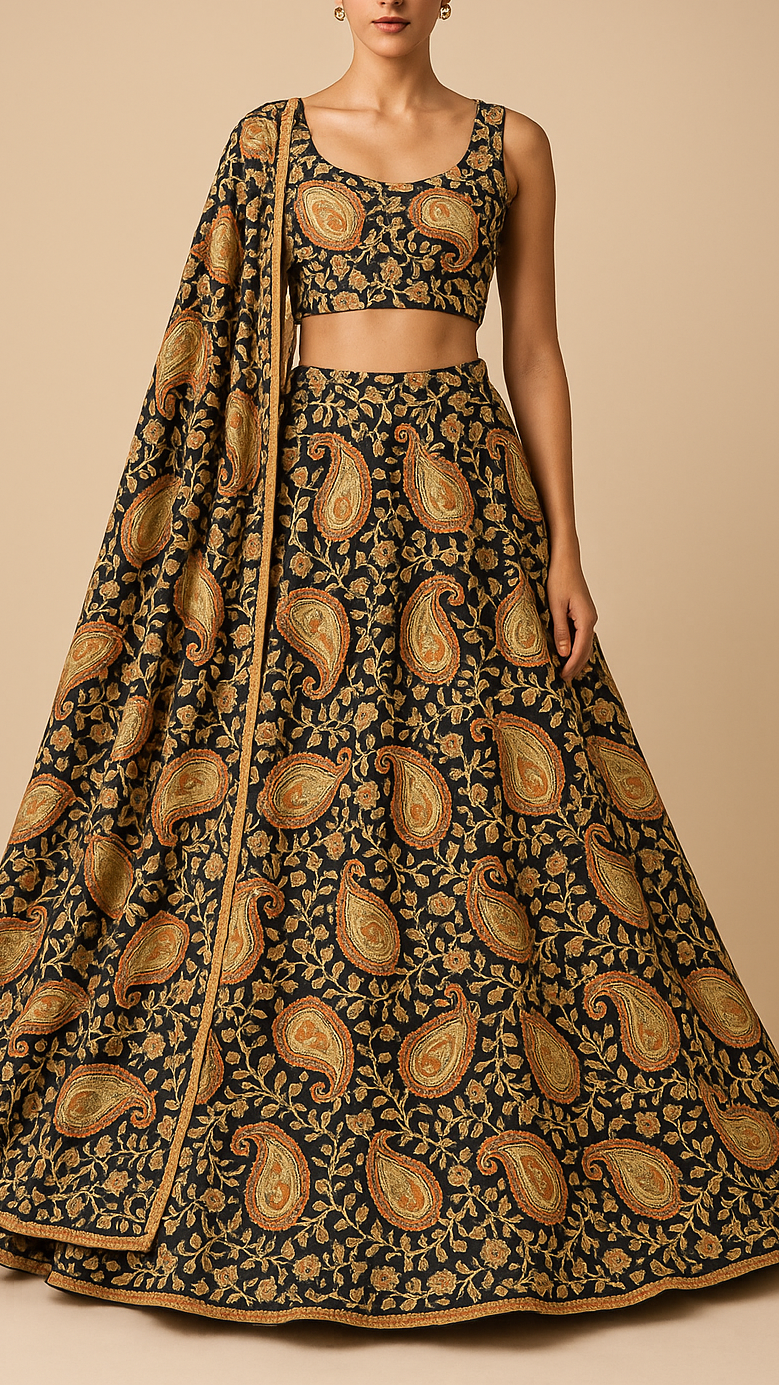 | Fabric Name | Black Crepe Fabric With All Over Traditional Print With Zari And Sequins Work |