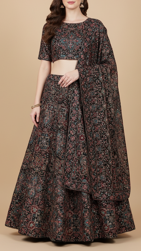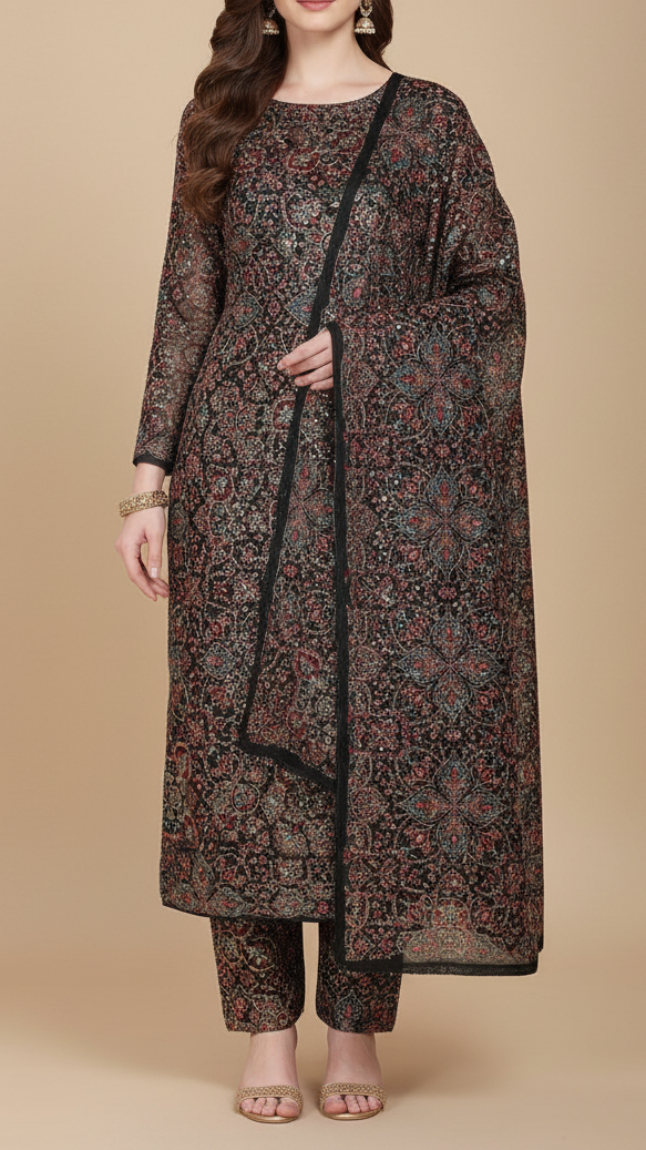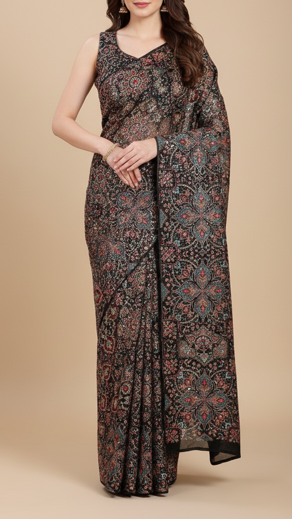 | Fabric Name | Black Georgette Fabric With All Over Multi-Colour Thread And Sequins Work |