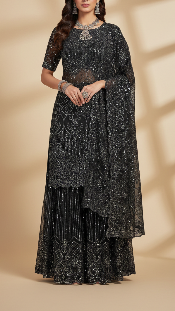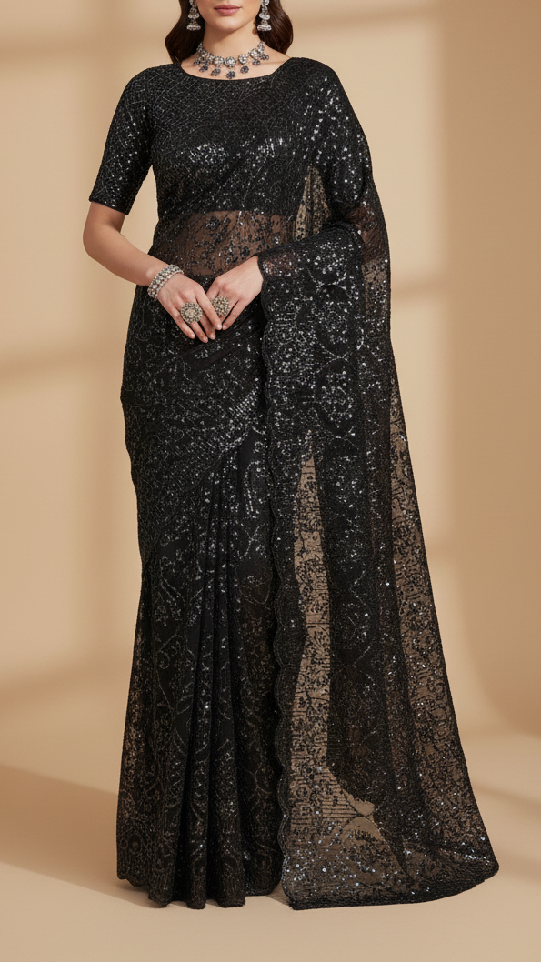 | Fabric Name | Black Georgette Fabric with Allover Sequins Work and One-Side Scalloped Border |