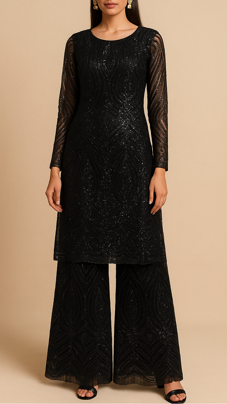 Black Imported Net Fabric With All Over Bead And Sequins Work 19422