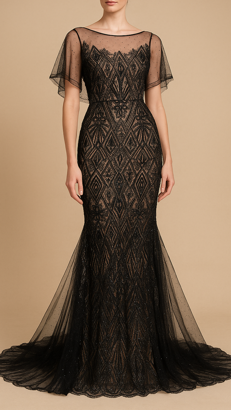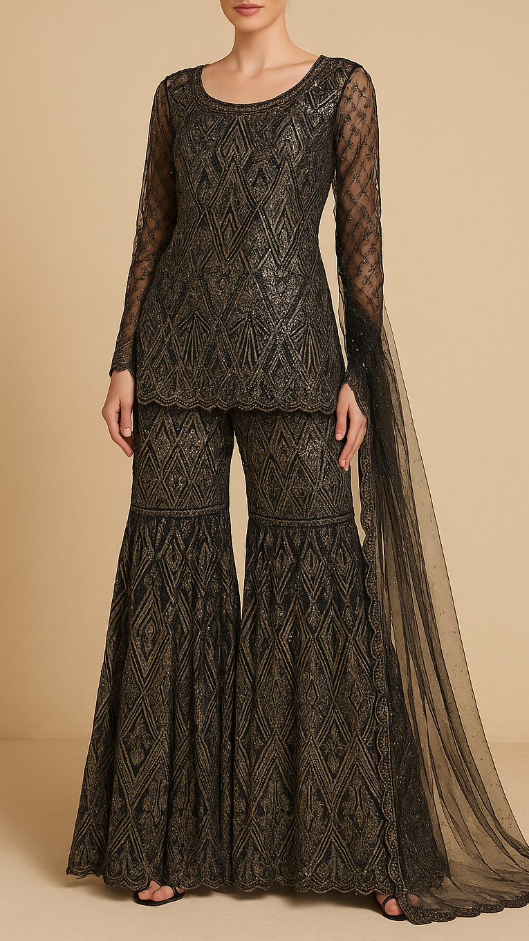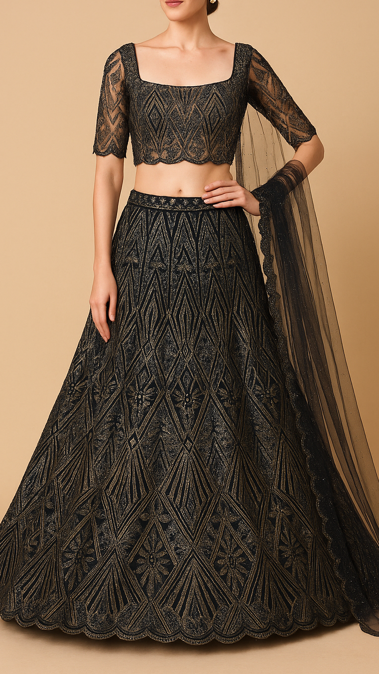 | Fabric Name | Black Imported Net Fabric With All Over Bead And Sequins Work With Two Side Scalloped Border |