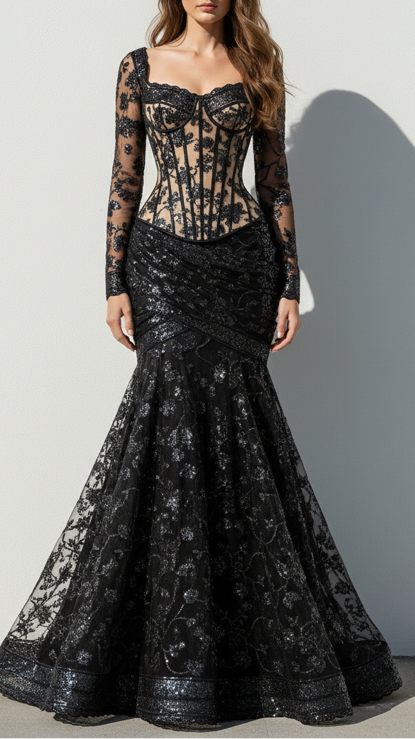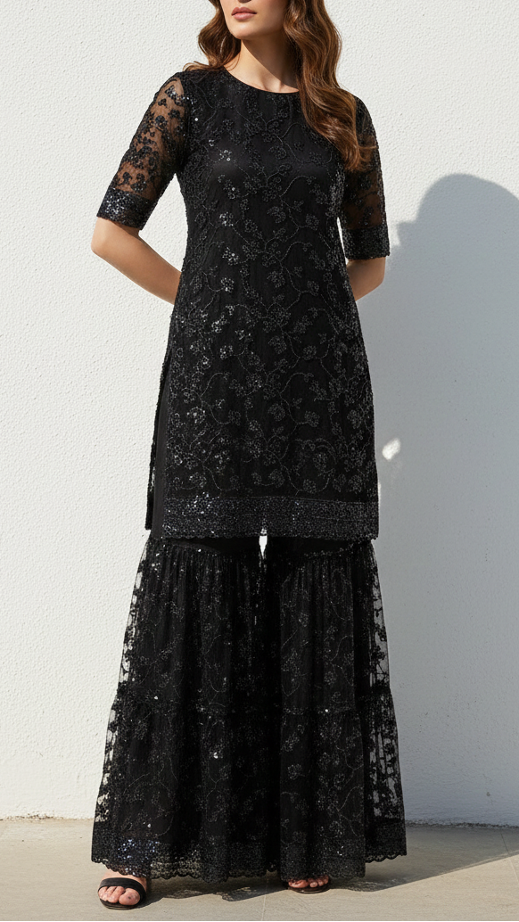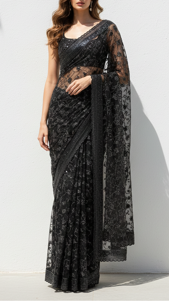 | Fabric Name | Black Imported Net Fabric With All Over Katdana, Bead And Sequins Work With One Side Scalloped Border |