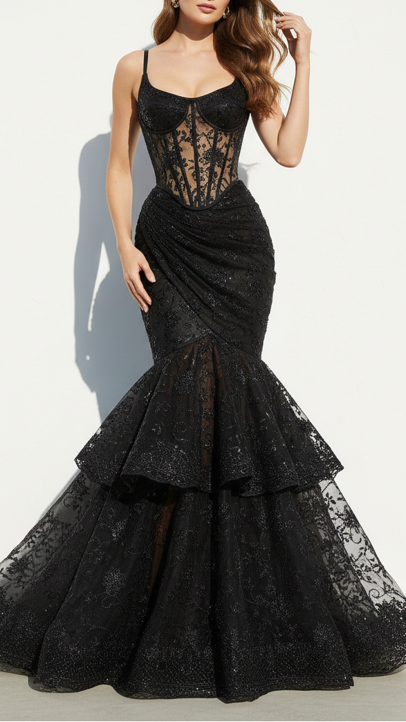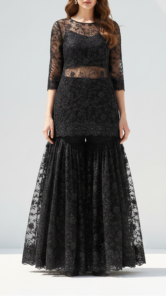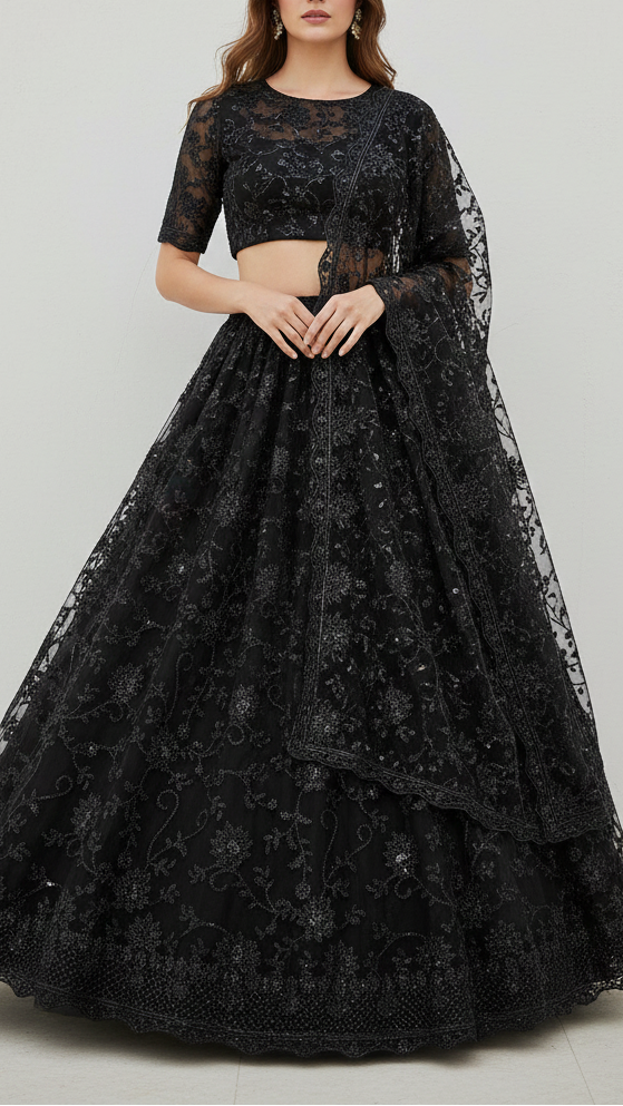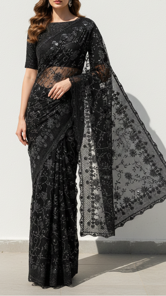 | Fabric Name | Black Imported Net Fabric With All Over Katdana, Bead And Sequins Work With One Side Scalloped Border |