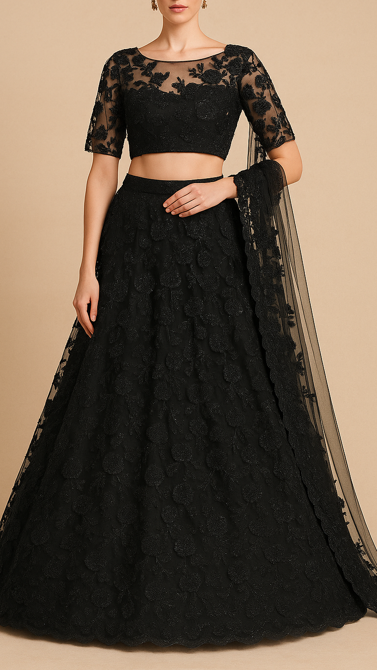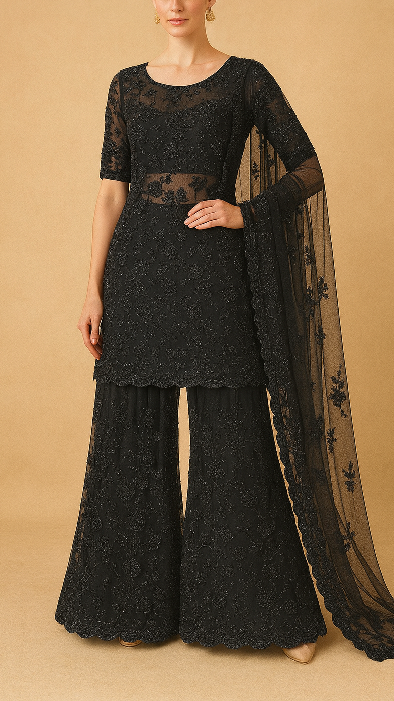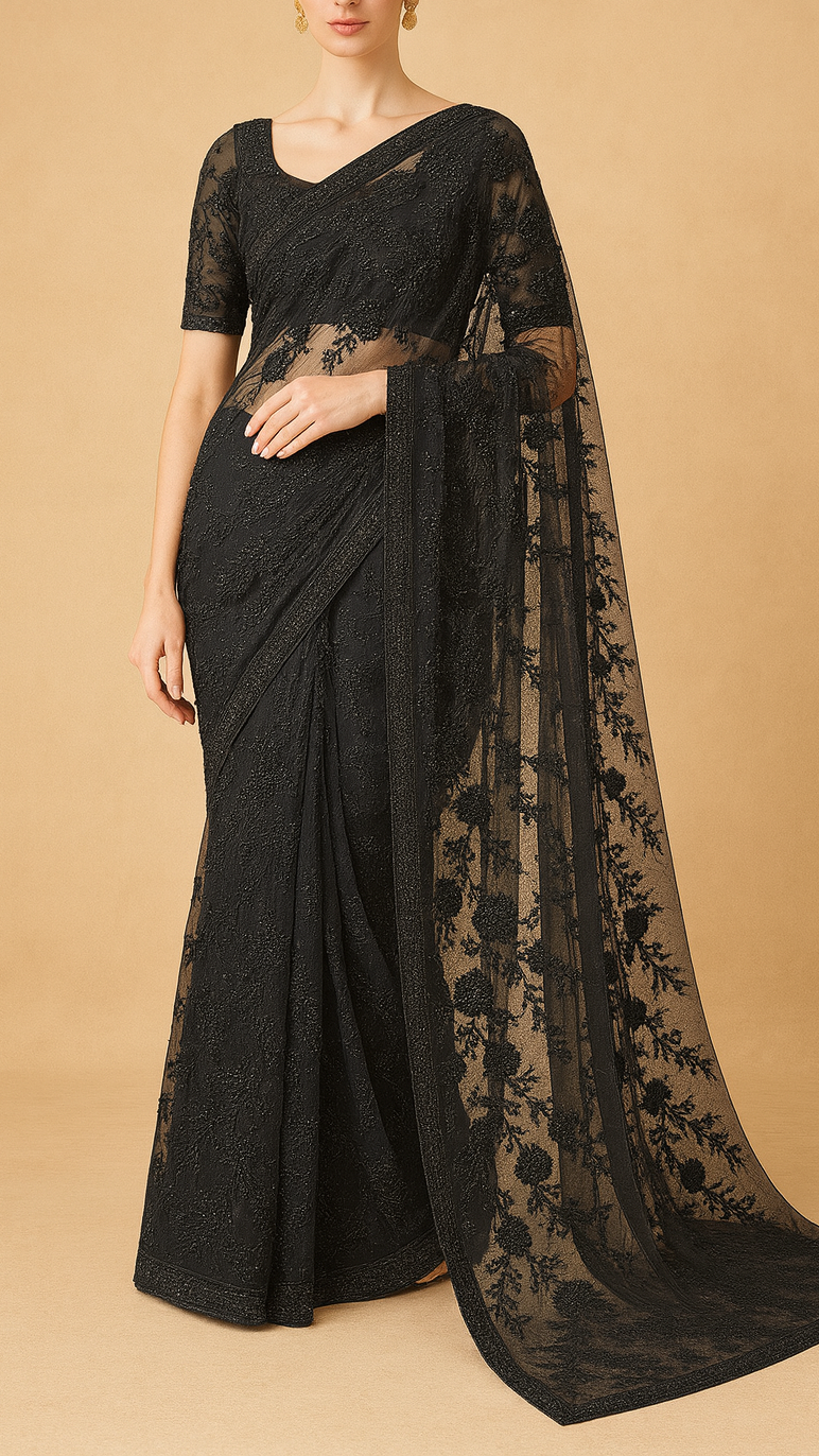 | Fabric Name | Black Imported Net Fabric With All Over Katdana, Bead, Sequins And Ribbon Work |