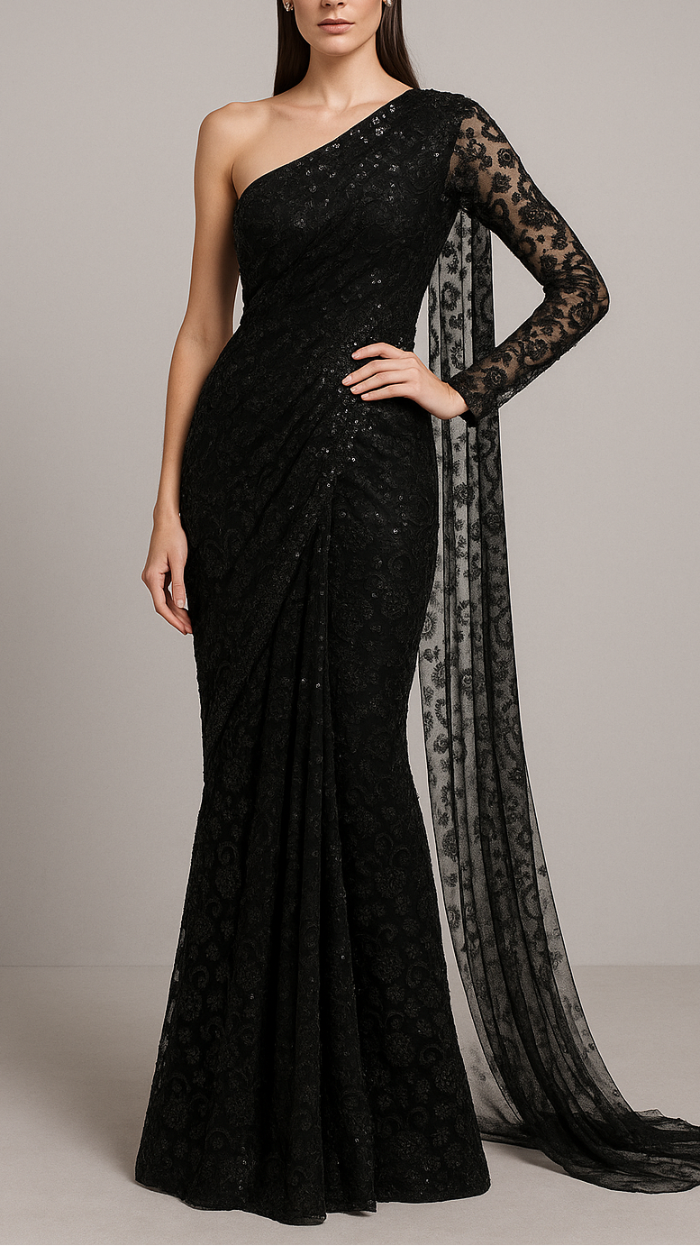 Black Imported Net Fabric With All Over Sequins And Bead Work 19391