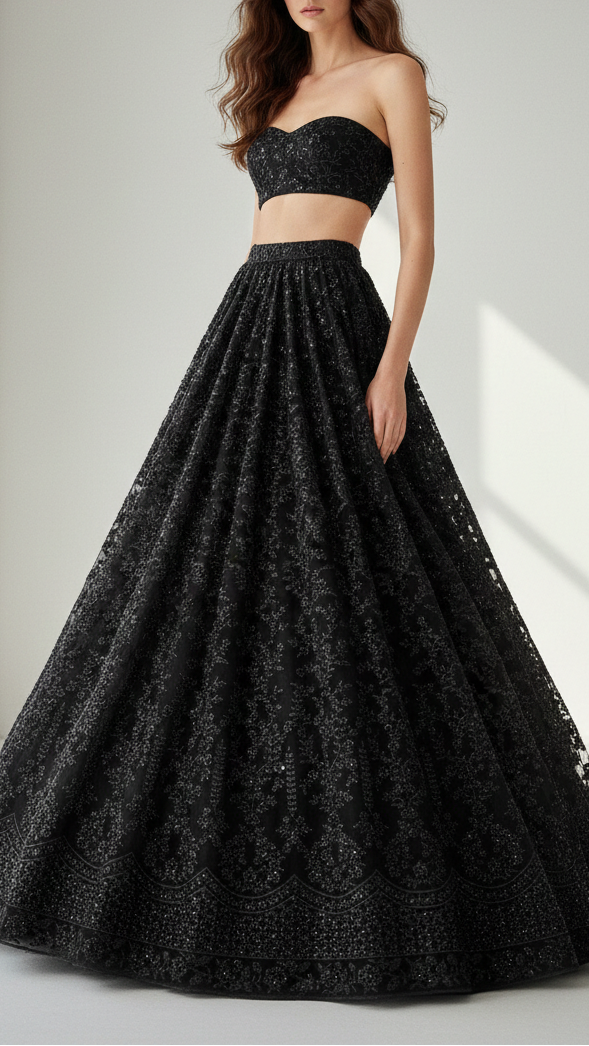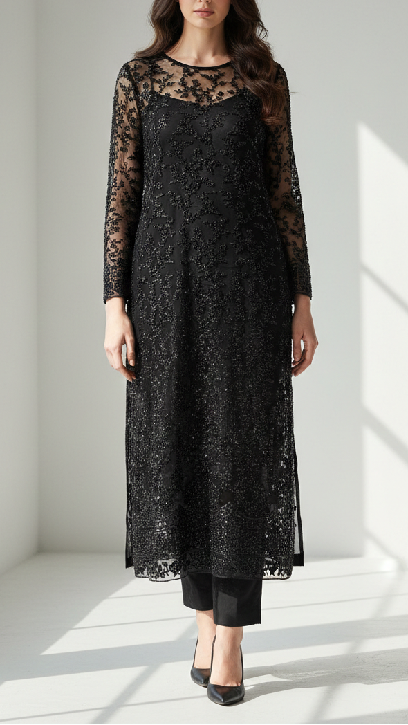 | Fabric Name | Black Imported Net Fabric with All-Over Thread and Sequins Work with One Side Heavy Border |