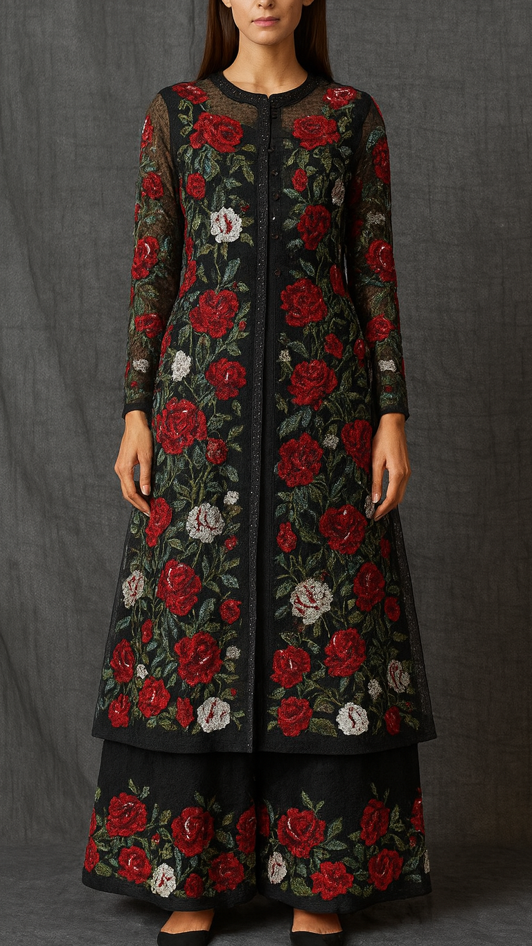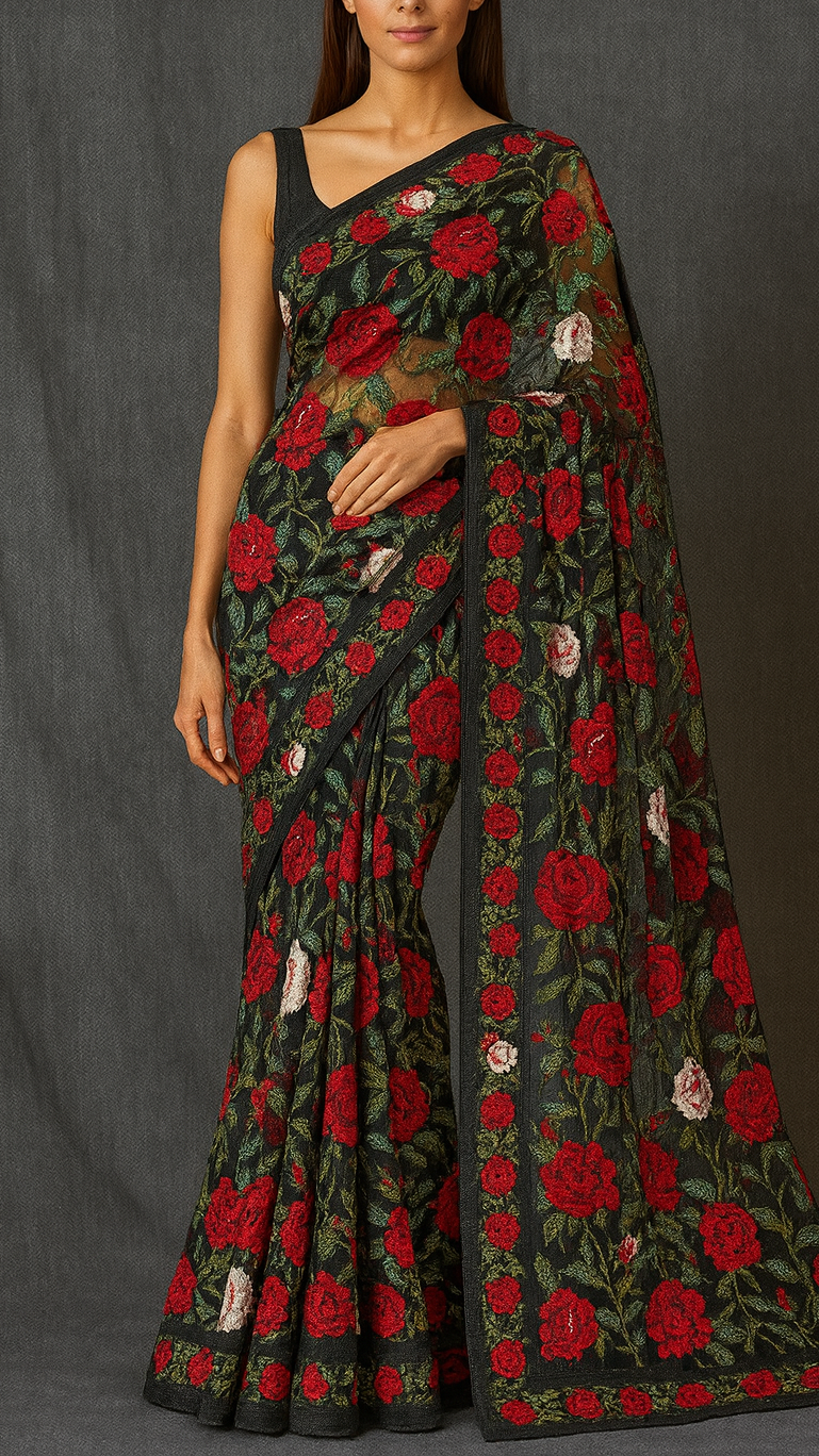 Fabric Name | Black Imported Net Fabric With All Over Thread Work Flowers |