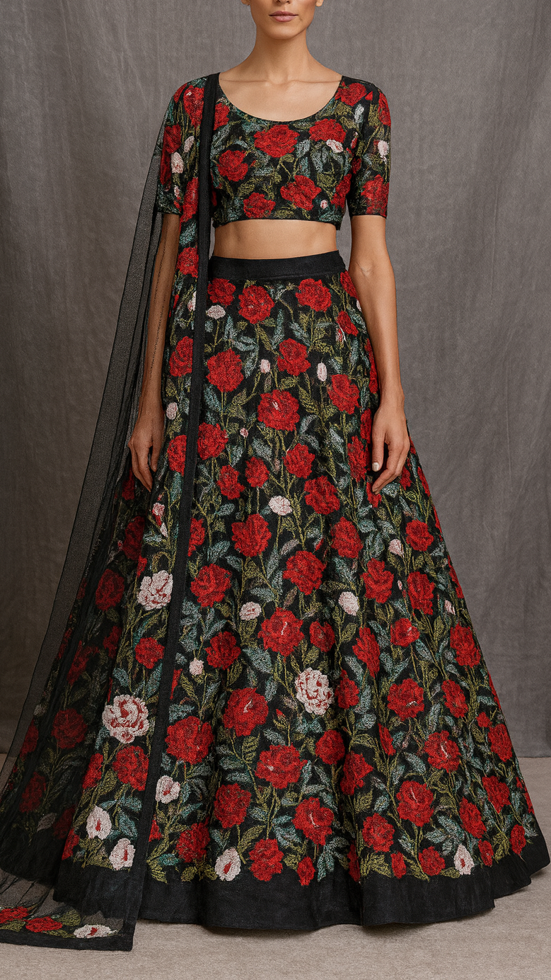 Black Imported Net Fabric With All Over Thread Work Flowers 19534