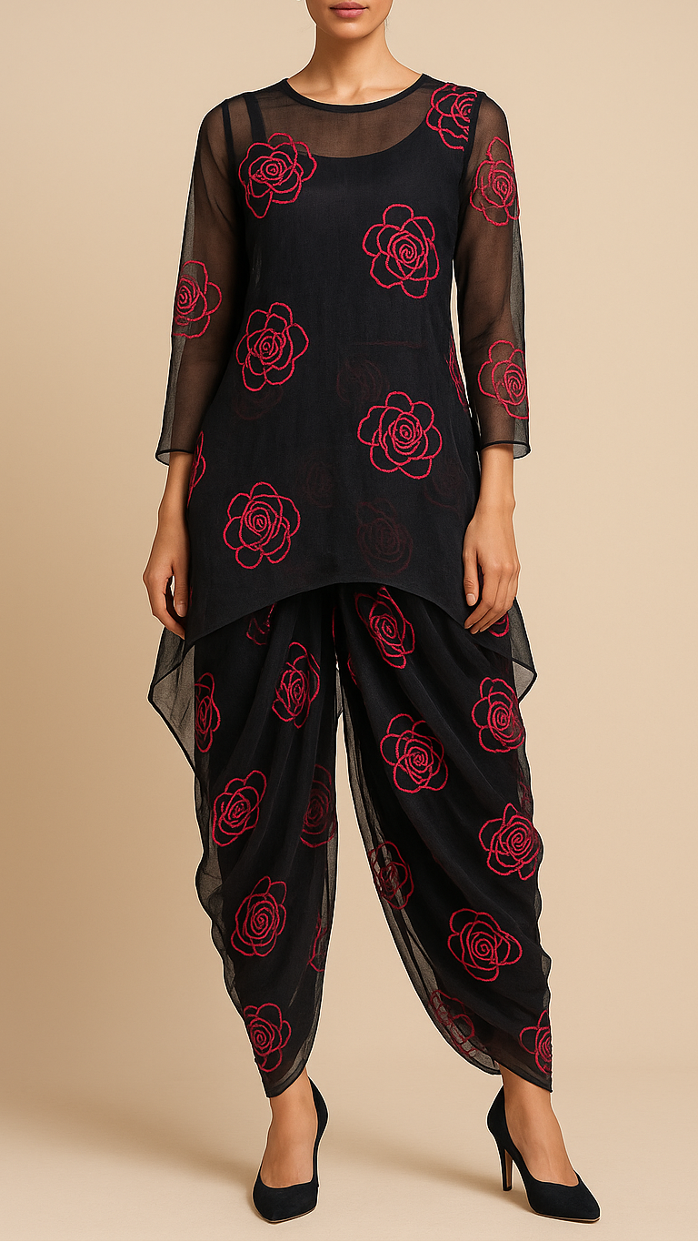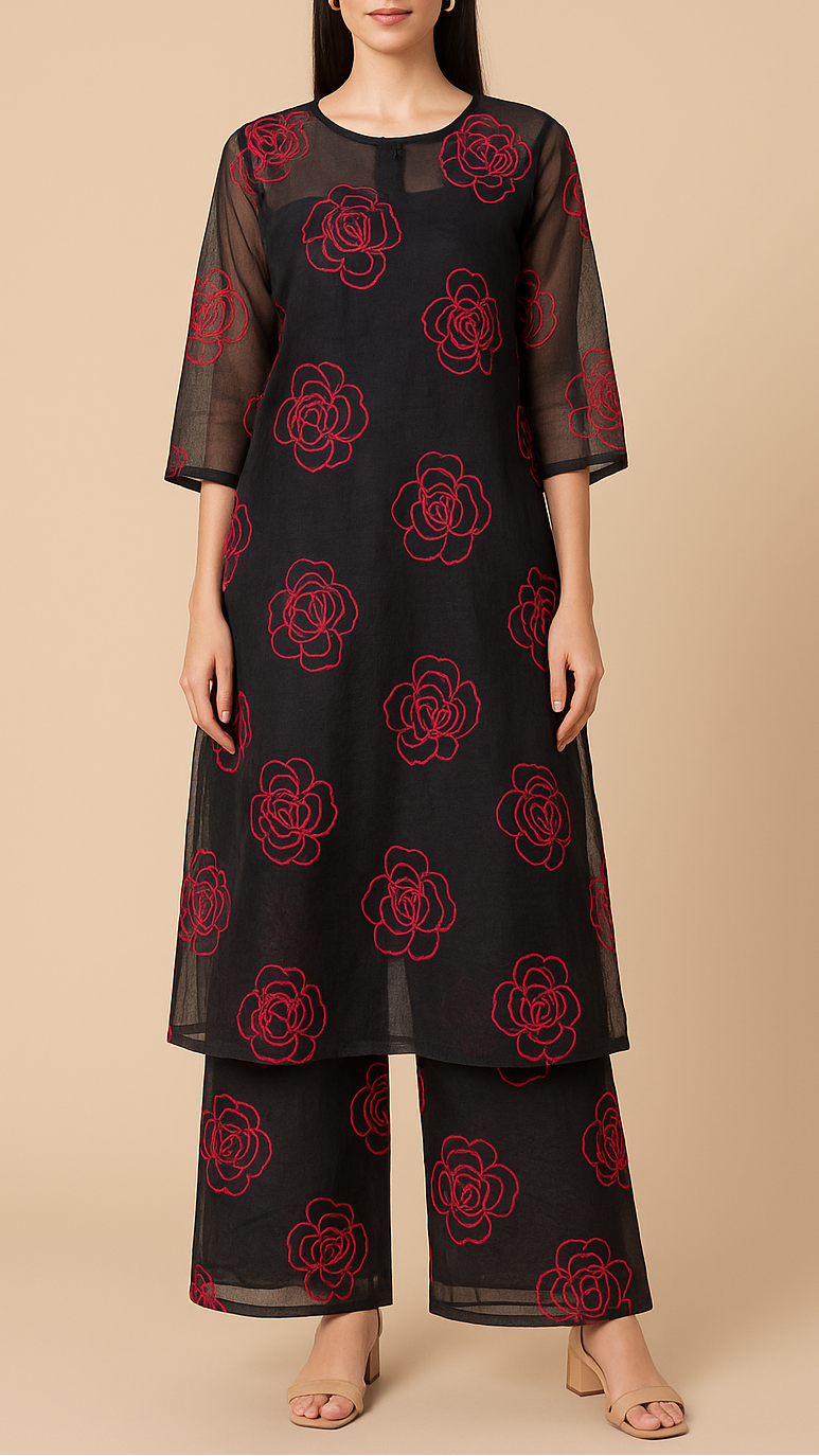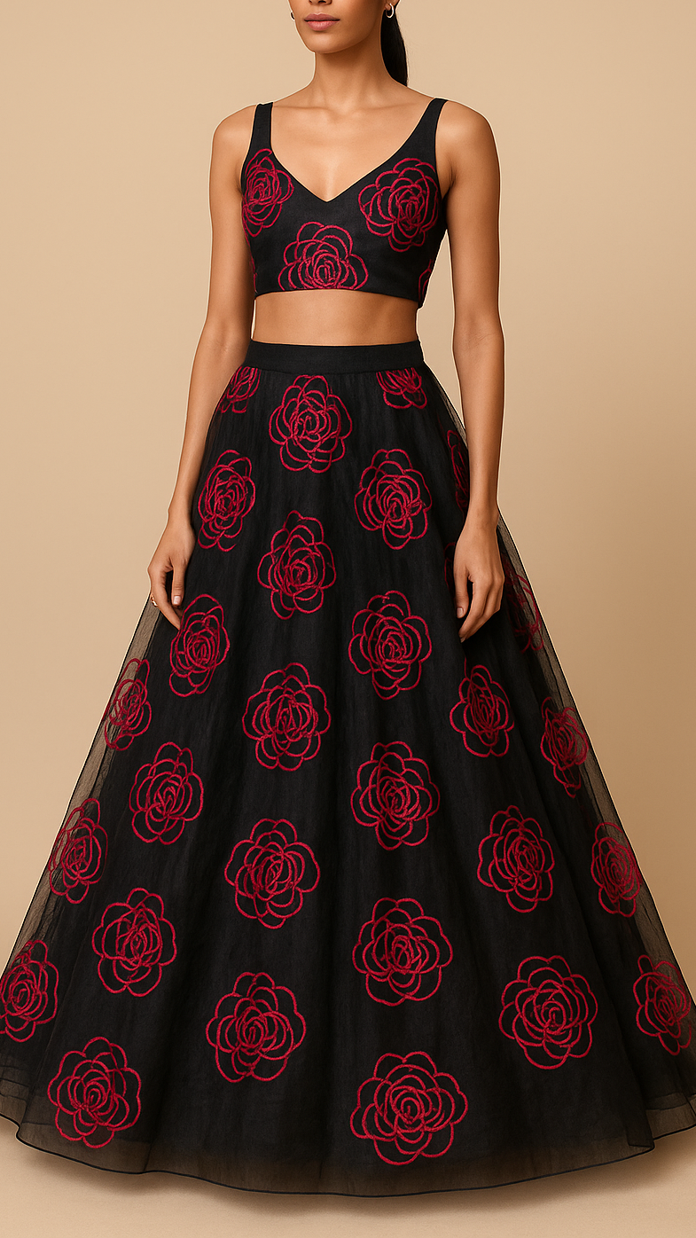 | Fabric Name | Black Organza Fabric With All Over Red Thread Work Flowers |