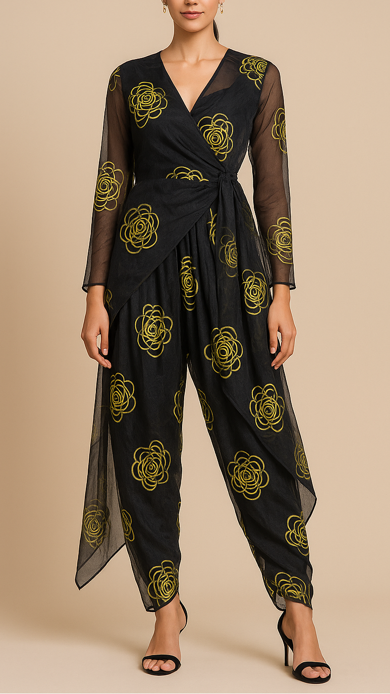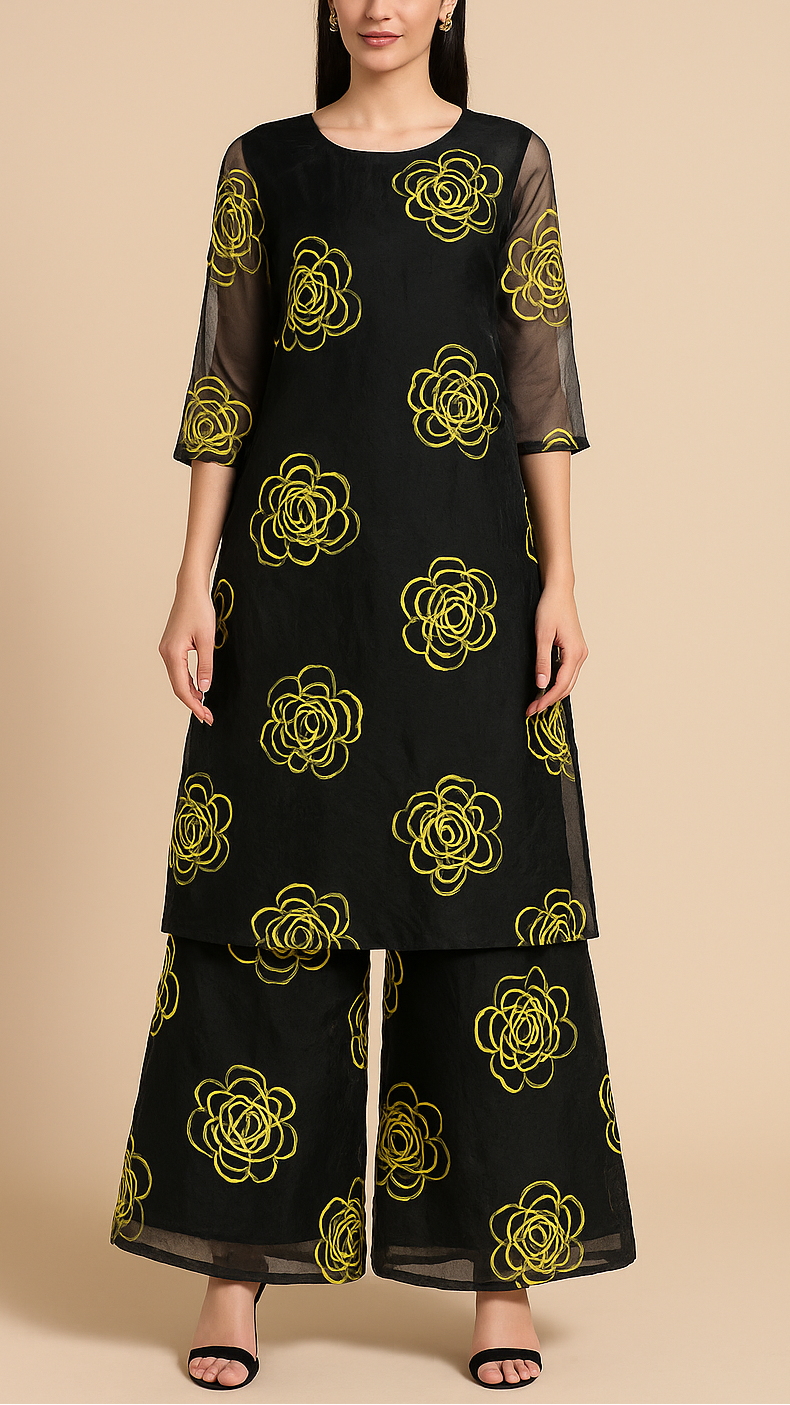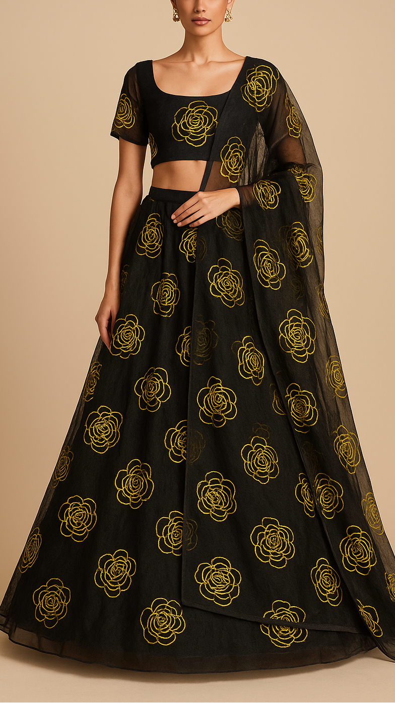 | Fabric Name | Black Organza Fabric With All Over Yellow Thread Work Flowers |