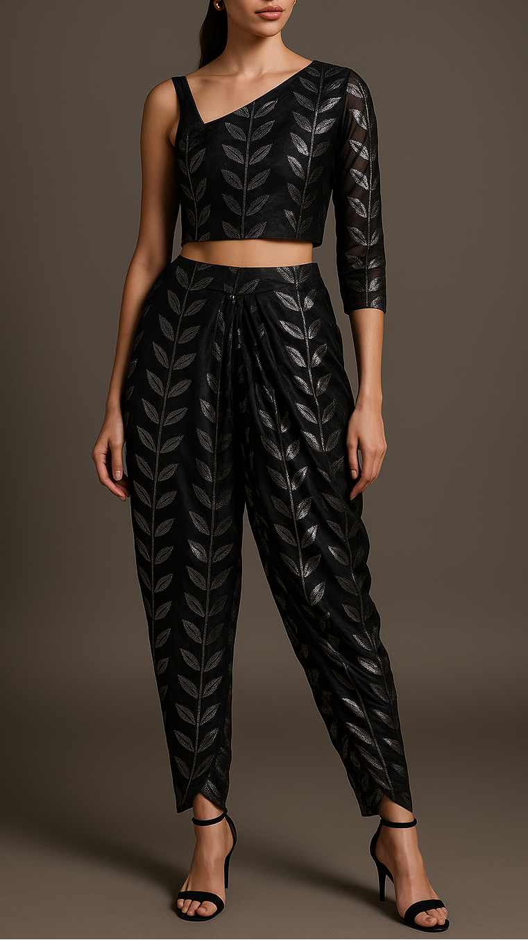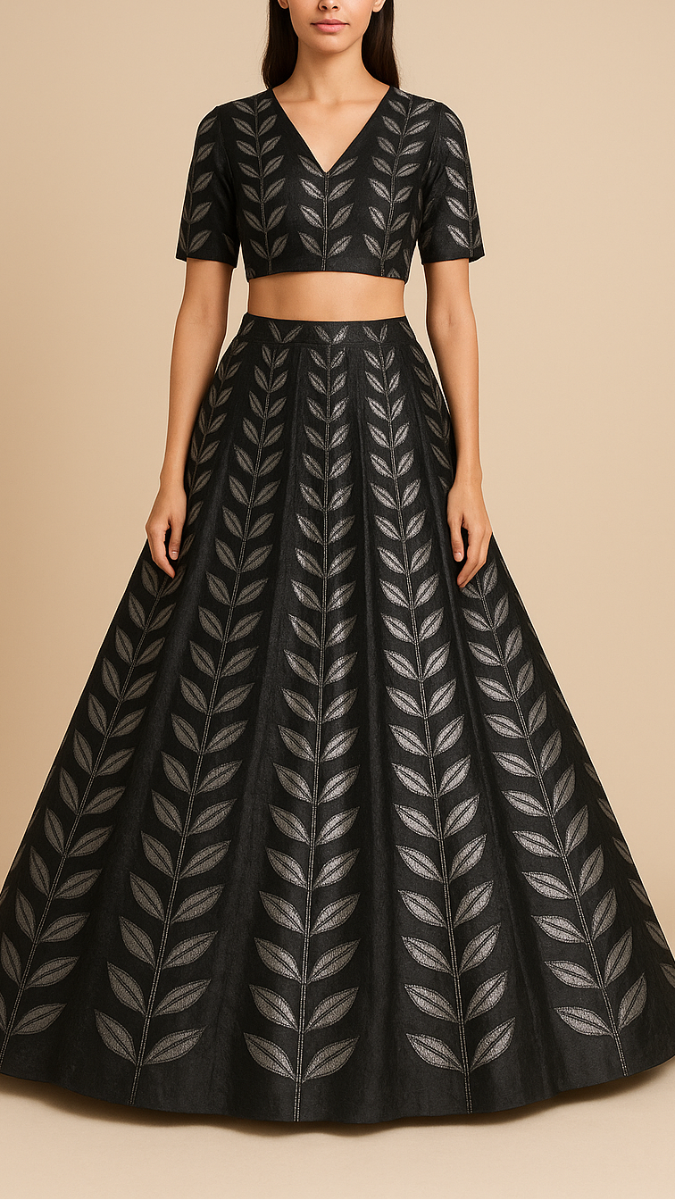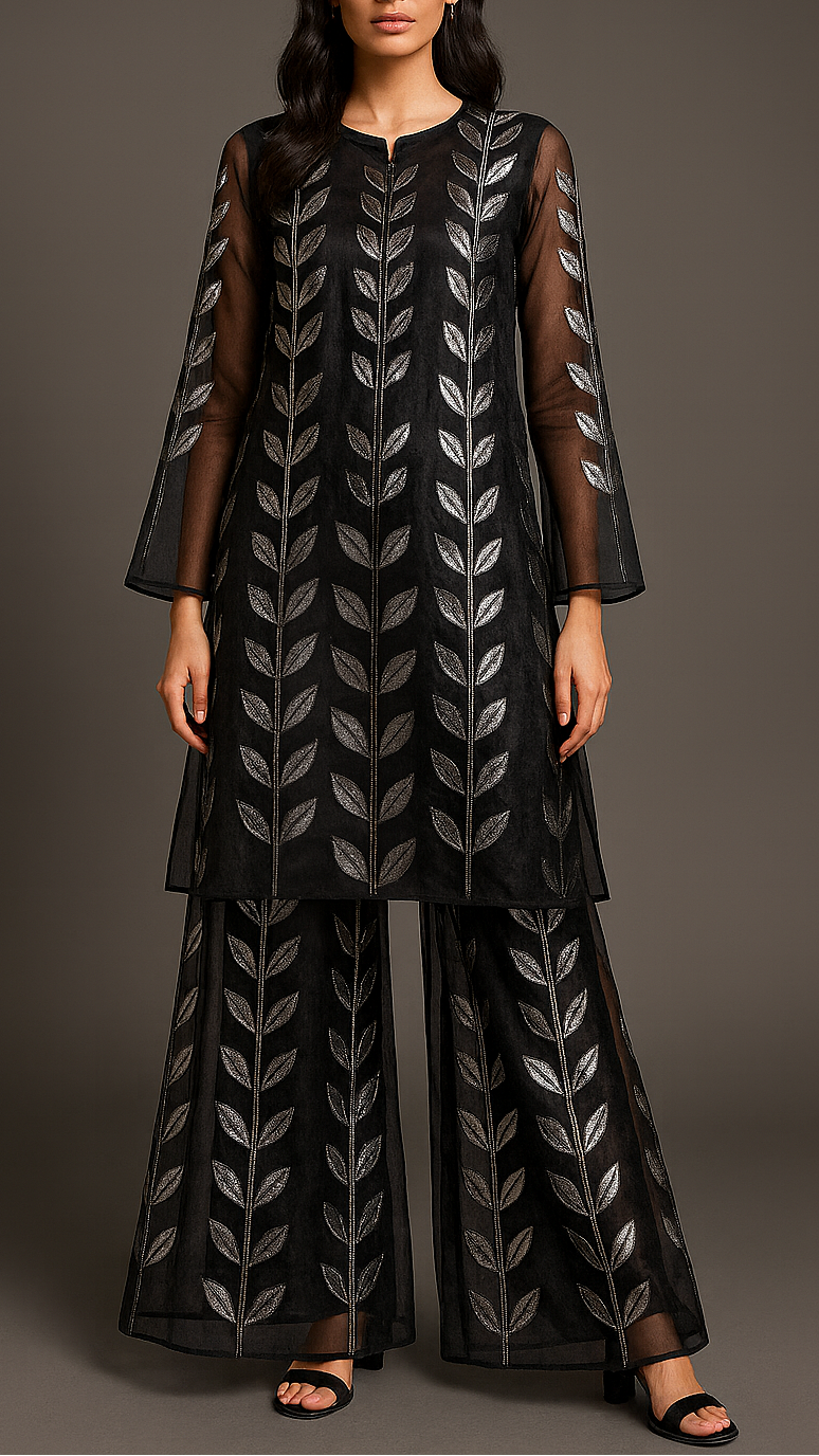 Fabric Name | Black Organza Fabric With All Over Leaves Of Foil And Threadwork |