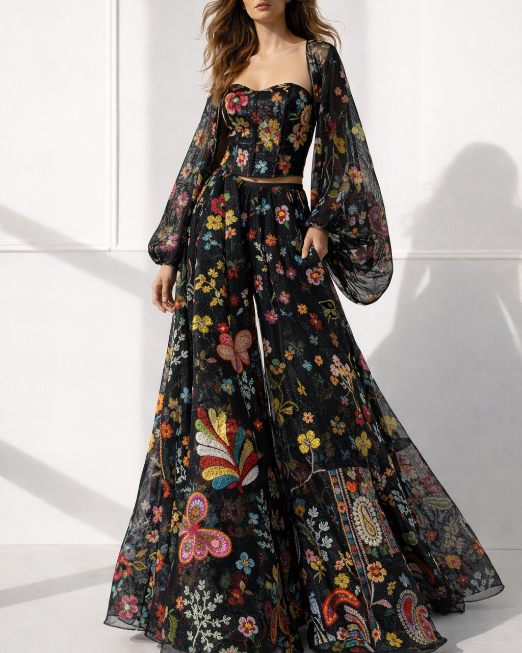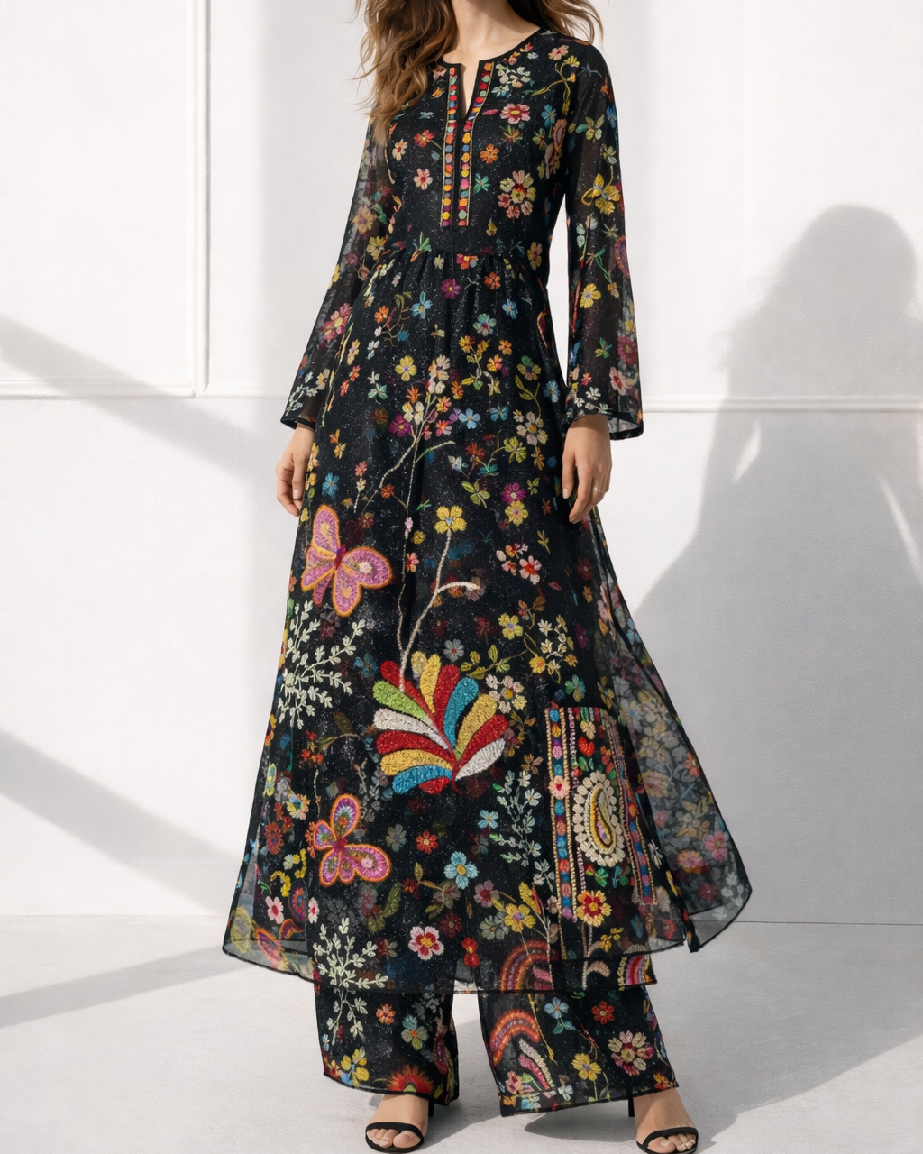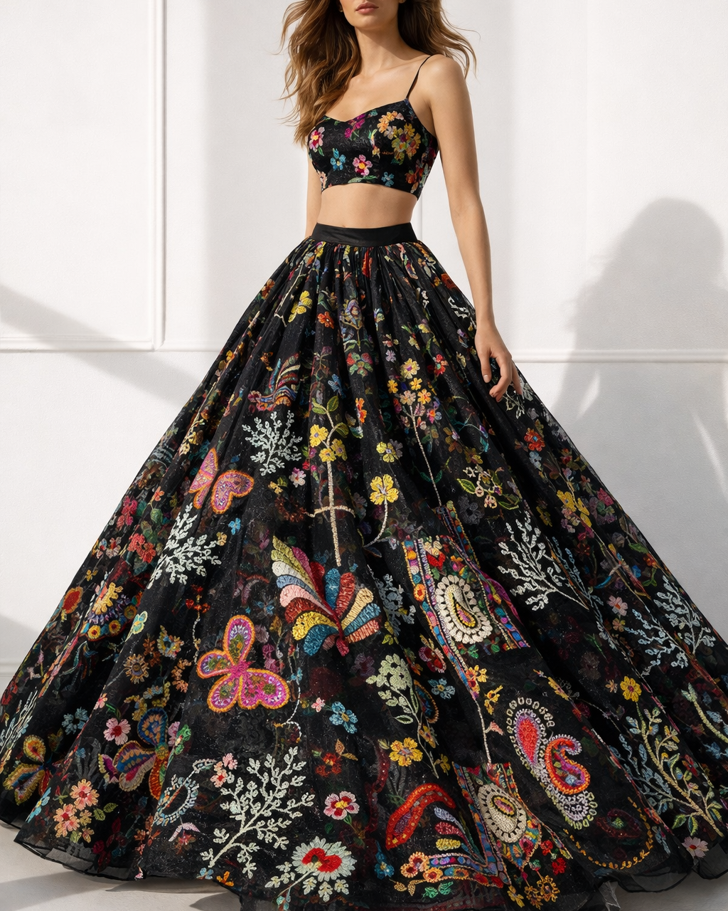 | Fabric Name | Black Organza Fabric with Allover Multicolor Thread, Patchwork, and Sequins |