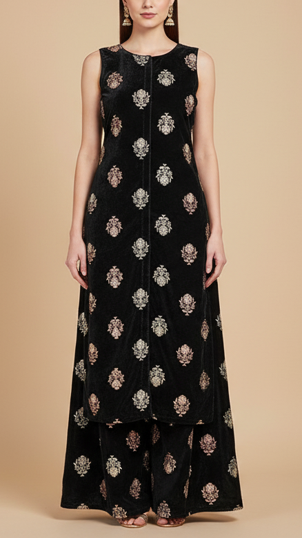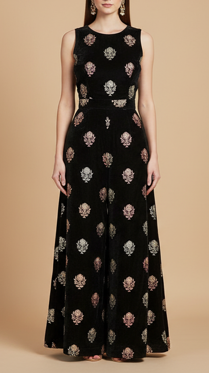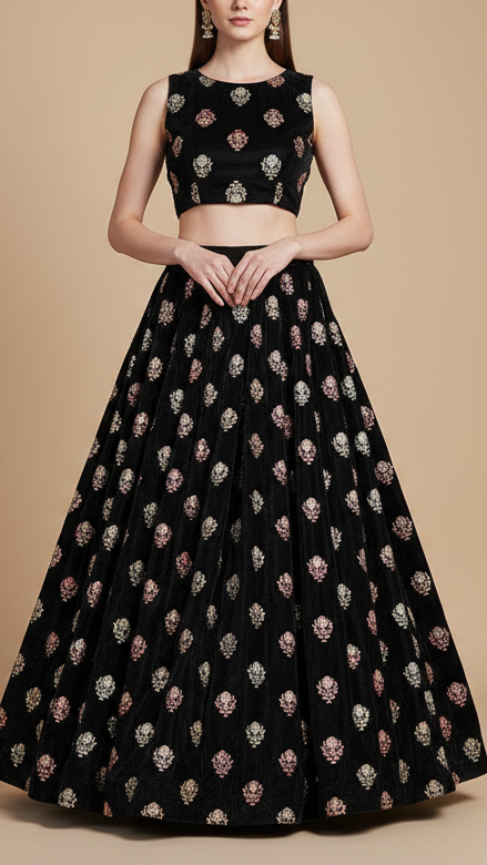 | Fabric Name | Black Velvet Fabric With All Over Buti Of Sequins And Zari Work |