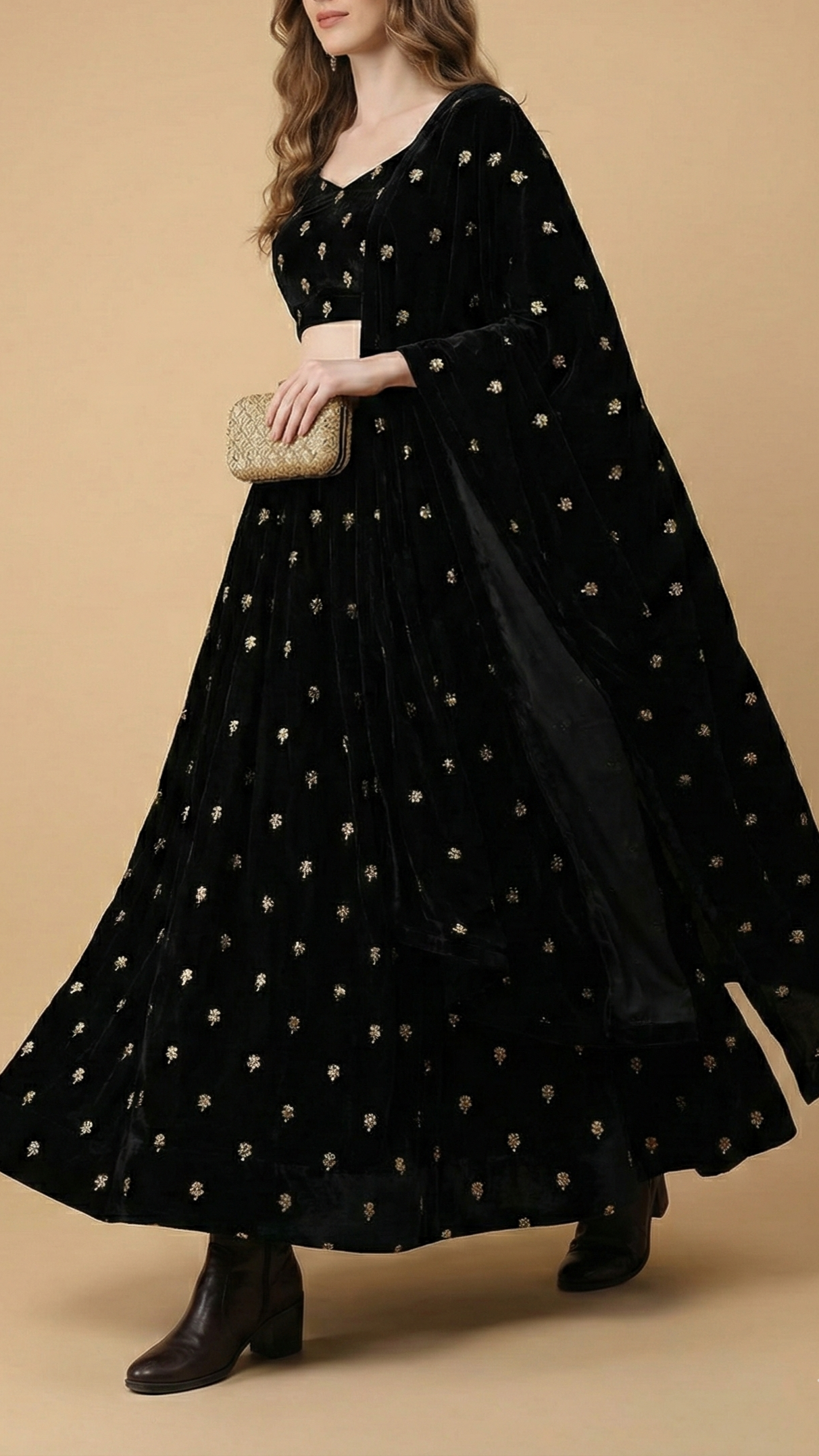 | Fabric Name | Black Velvet Fabric With All Over Buti Of Zari And Sequins Work |