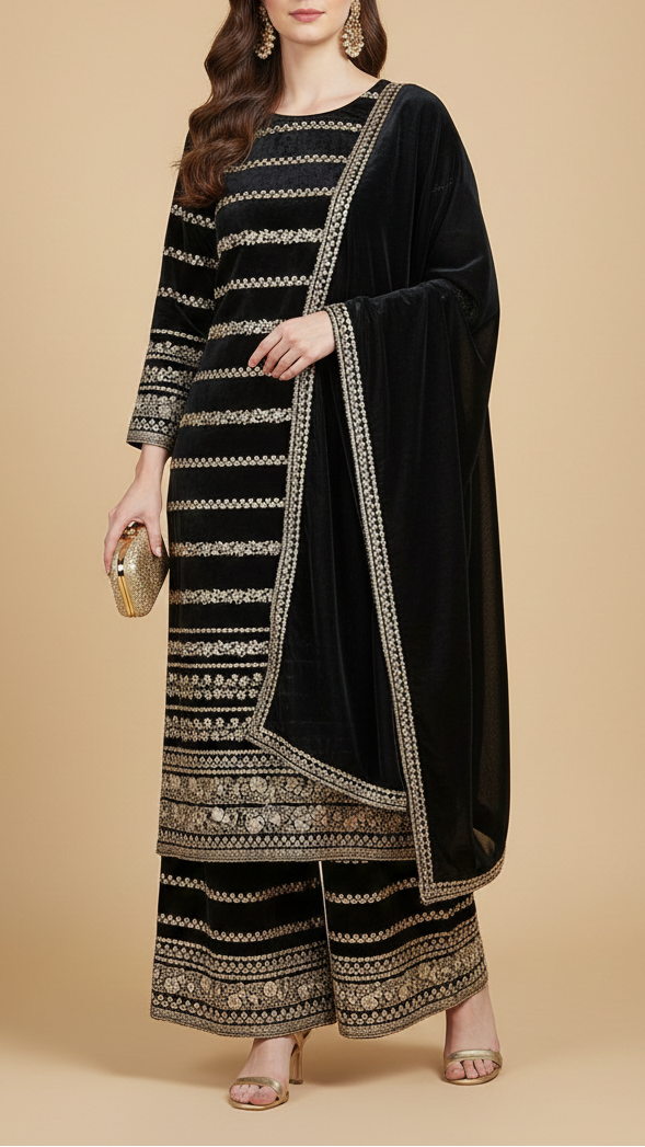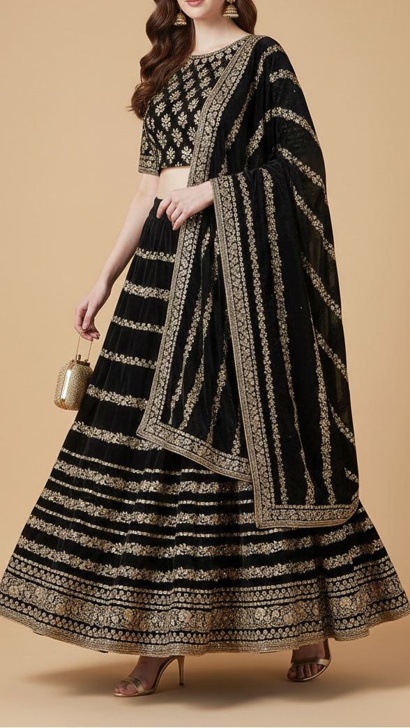 | Fabric Name | Black Velvet Fabric With All Over Golden Zari Work And One Side Border |