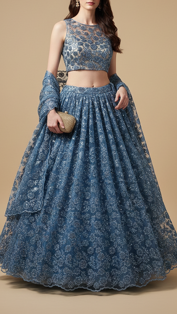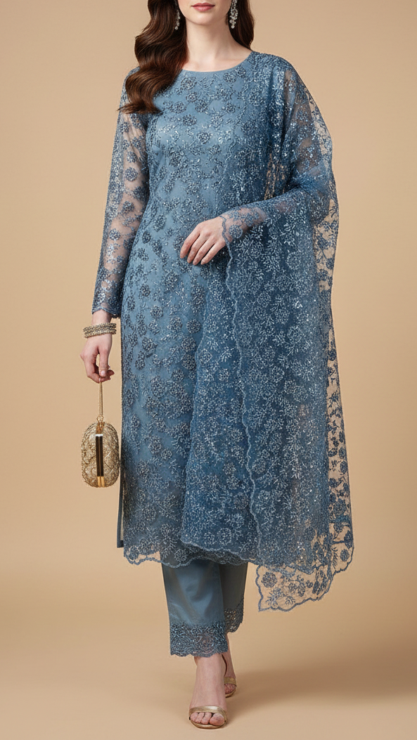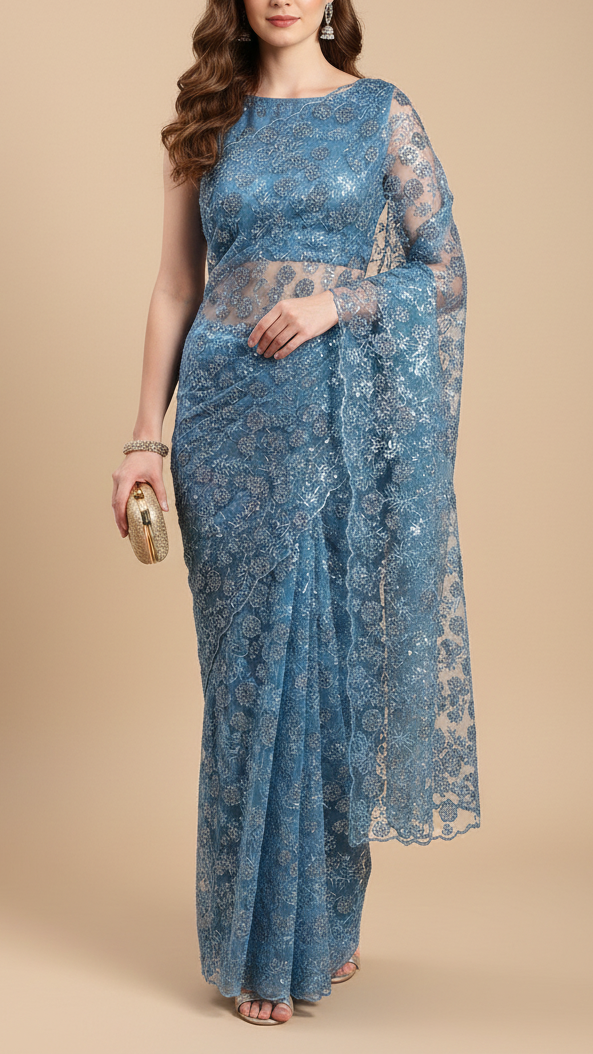 | Fabric Name | Blue Imported Net Fabric With All Over Bead, Sequins And Thread Work With Two Side Scalloped Edges |