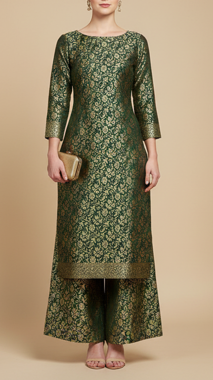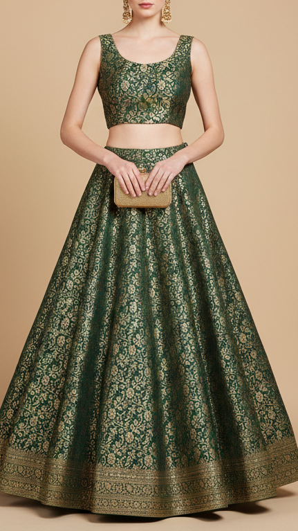 | Fabric Name | Bottle Green Banarasi Brocade Fabric With All Over Golden Zari Handloom |