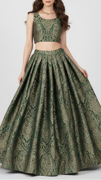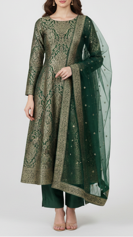 | Fabric Name | Bottle Green Banarasi Brocade Fabric With All Over Golden Zari Handloom |