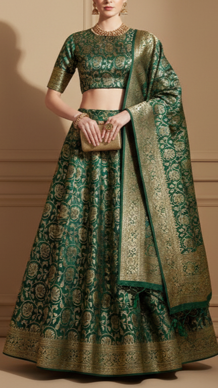 | Fabric Name | Bottle Green Banarasi Brocade Fabric with Allover Golden Zari Handloom |