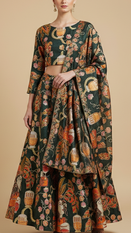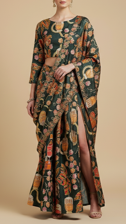 Bottle Green Crepe Fabric with All Over Zari and Sequins Work with Abstract Print 15989