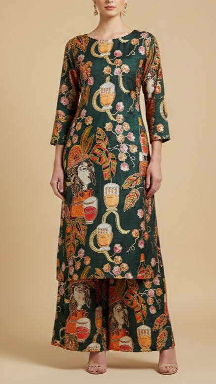 | Fabric Name | Bottle Green Crepe Fabric with All Over Zari and Sequins Work with Abstract Print |
