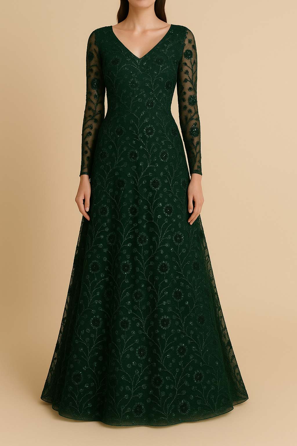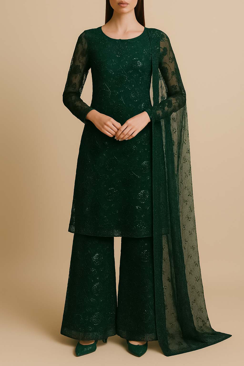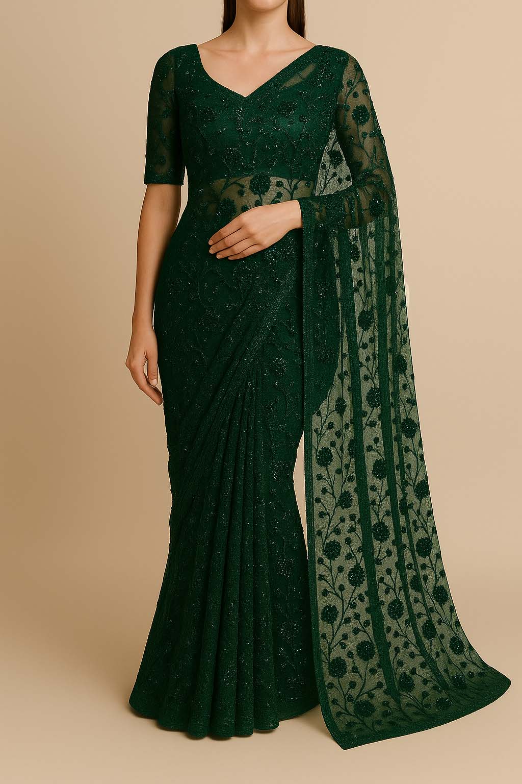 Bottle Green Imported Net Fabric With All Over Sequins And Katdana Work 16290