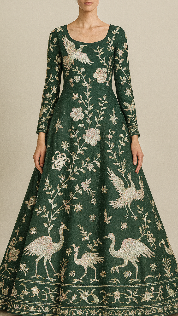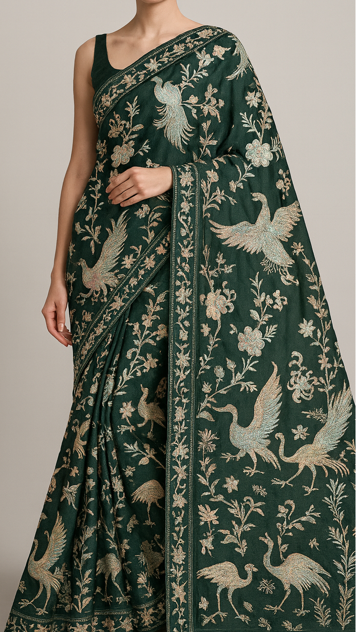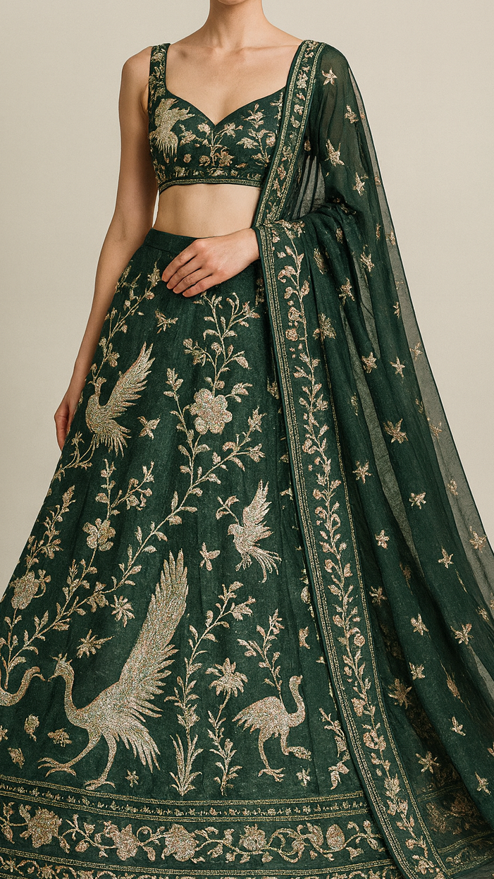 | Fabric Name | Bottle Green Silk Fabric With All Over Thread, Zari, Sequins And Swarvoski Work |