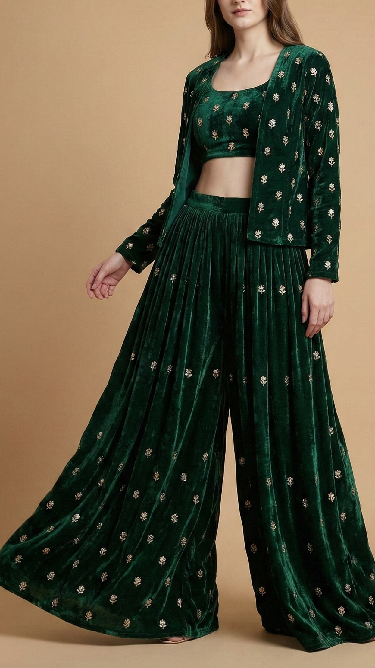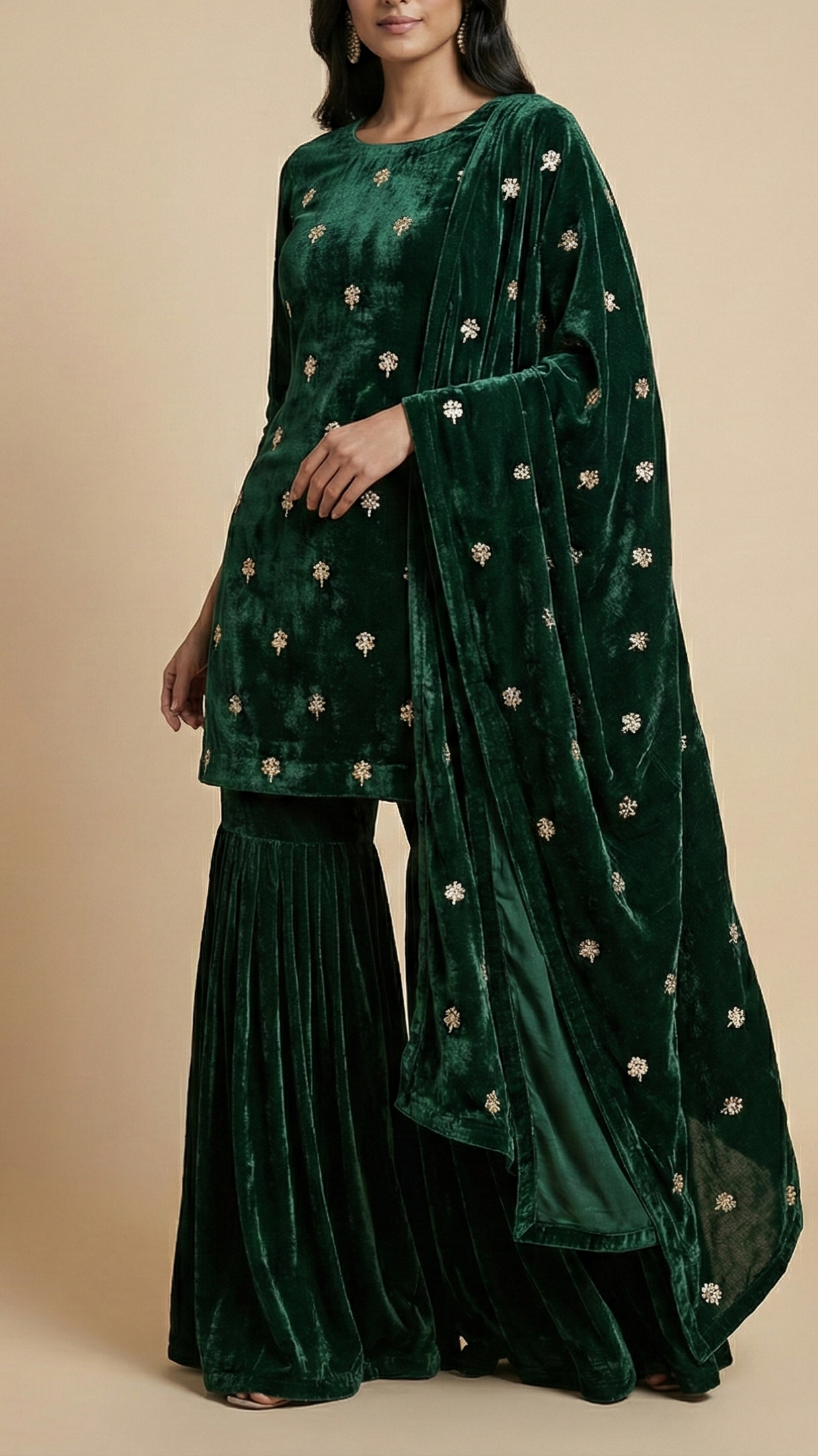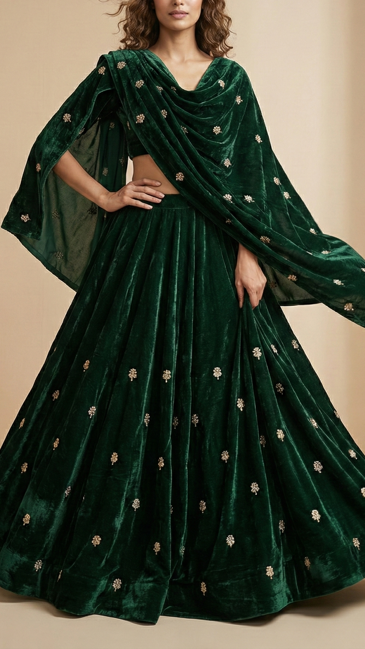 | Fabric Name | Bottle Green Velvet Fabric With All Over Buti Of Katdana, Sequins And Zari |