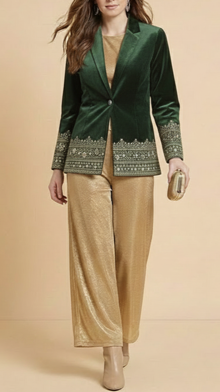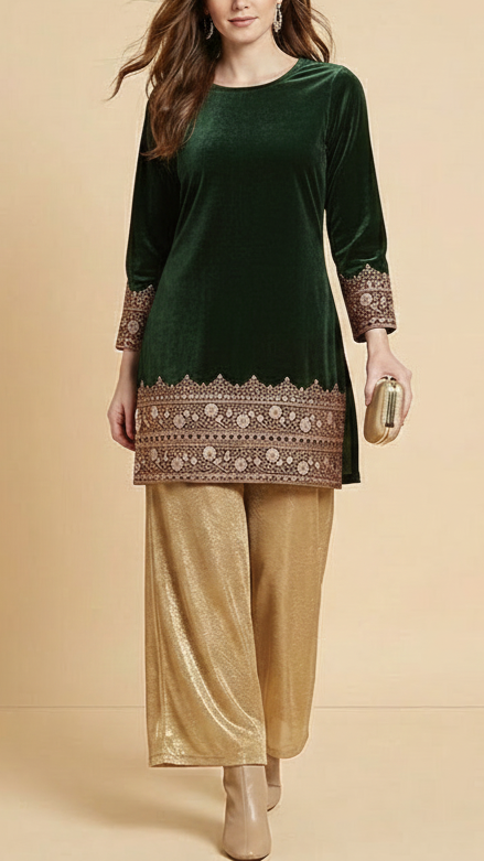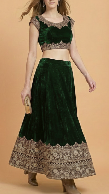 | Fabric Name | Bottle Green Velvet Fabric With Heavy Border Of Golden Zari And Sequins |