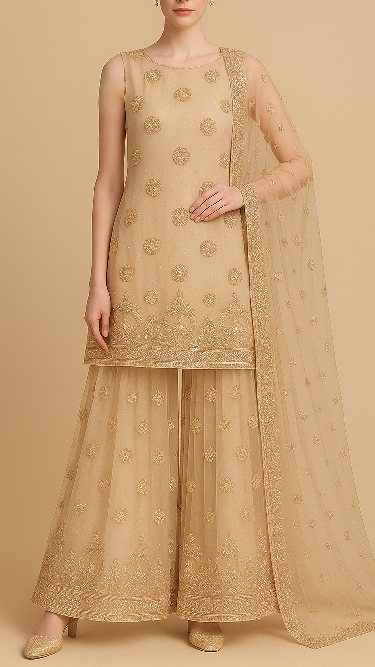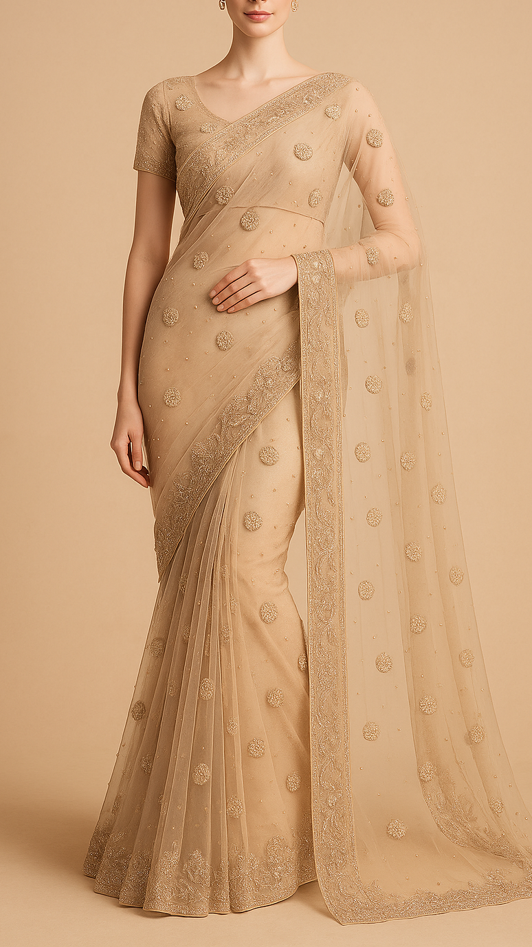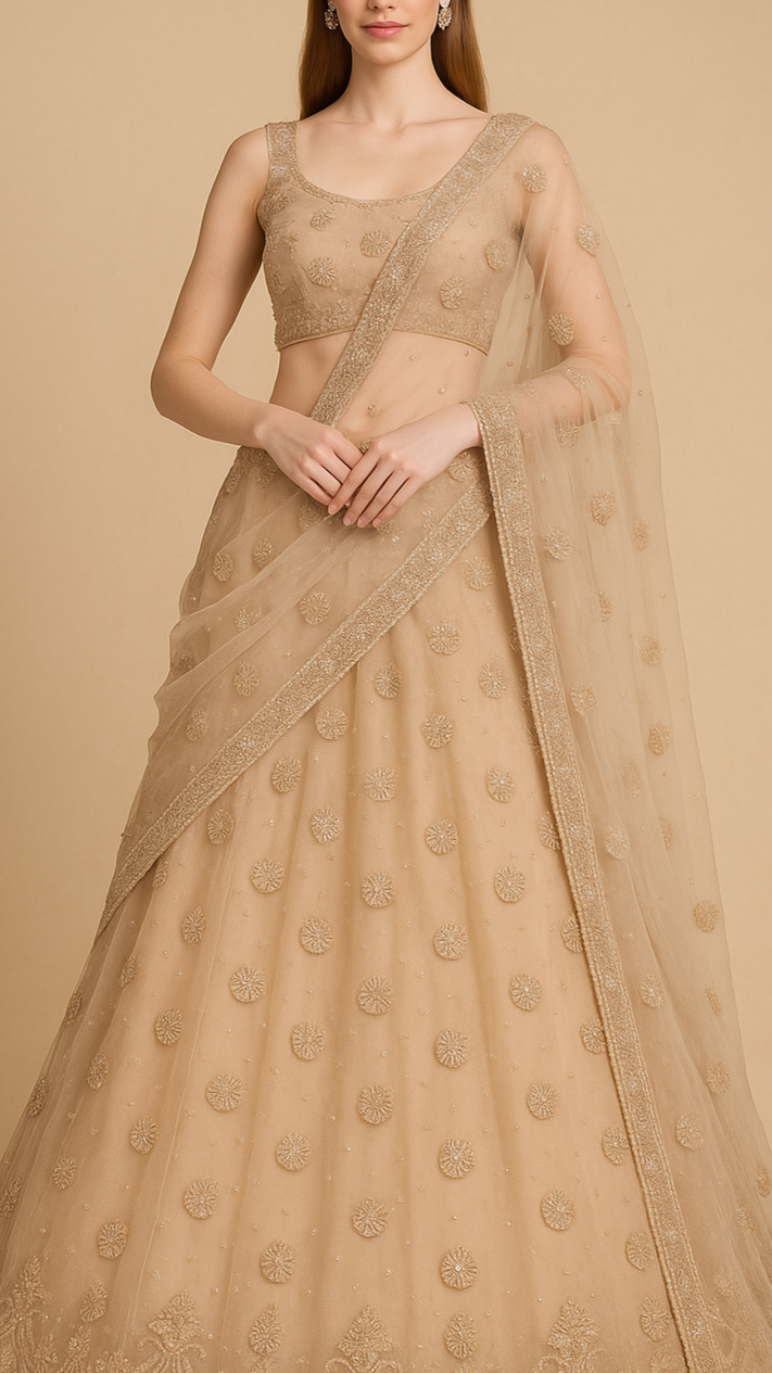 | Fabric Name | Chiku Net Dupatta Fabric With All Over Ribbon Work, Bead And Sequins Work With Two Side Border |