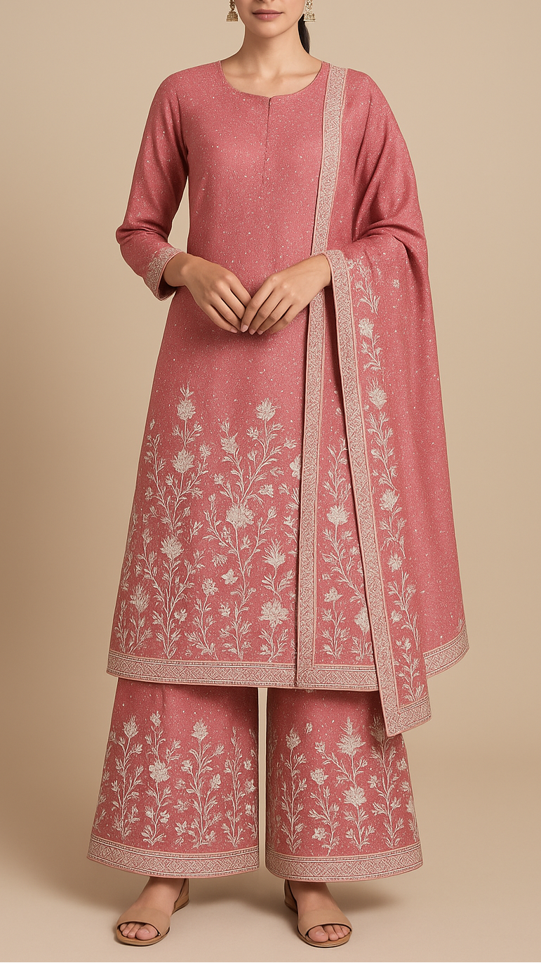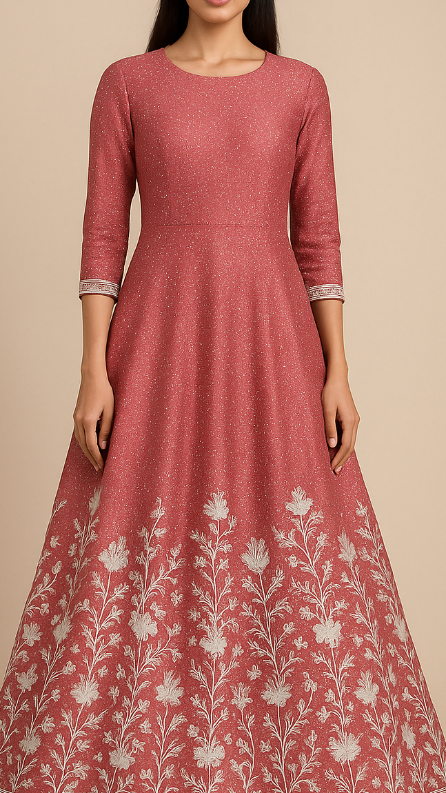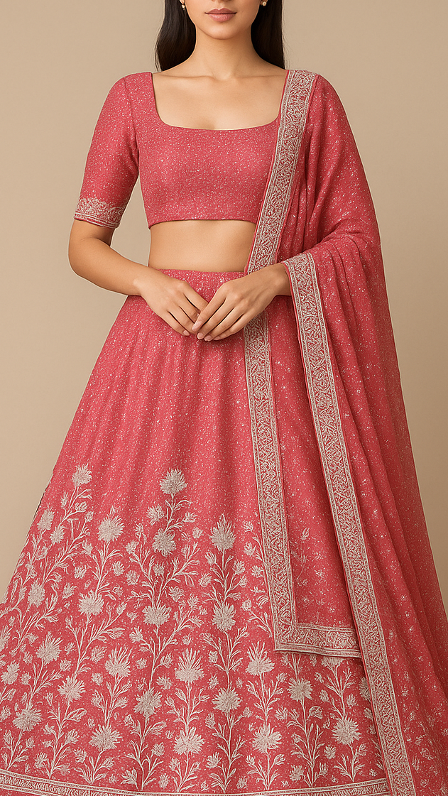 | Fabric Name | Coral Pink Silk Fabric With All Over Swarvoski Work Wit One Side Threadwork Border |