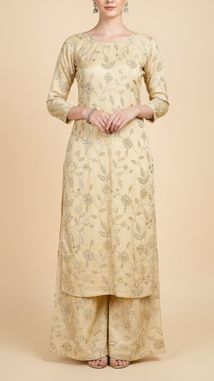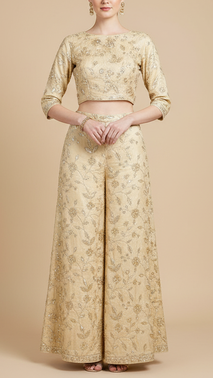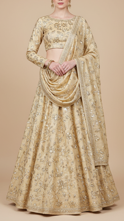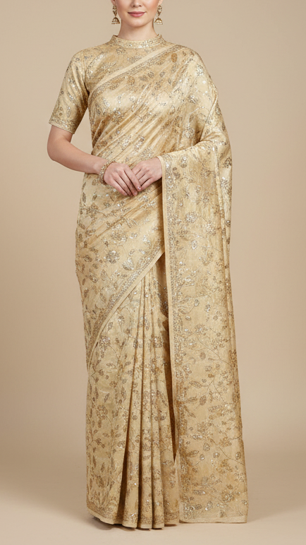 | Fabric Name | Cream Crepe Fabric With All Over Sequins, Bead And Zari |