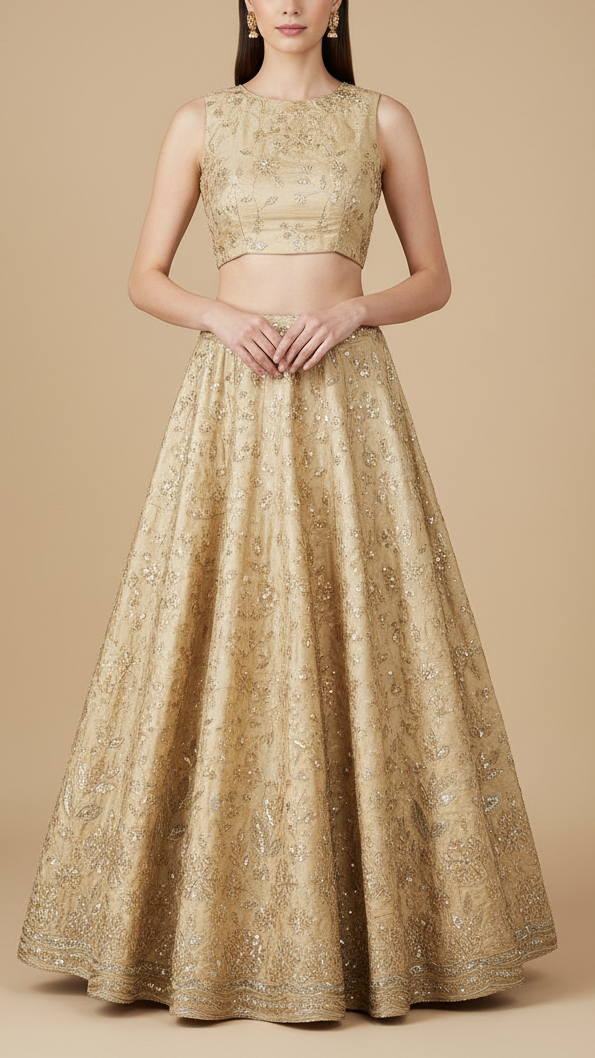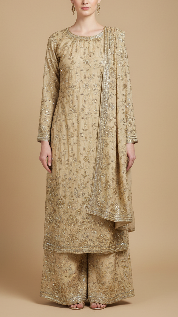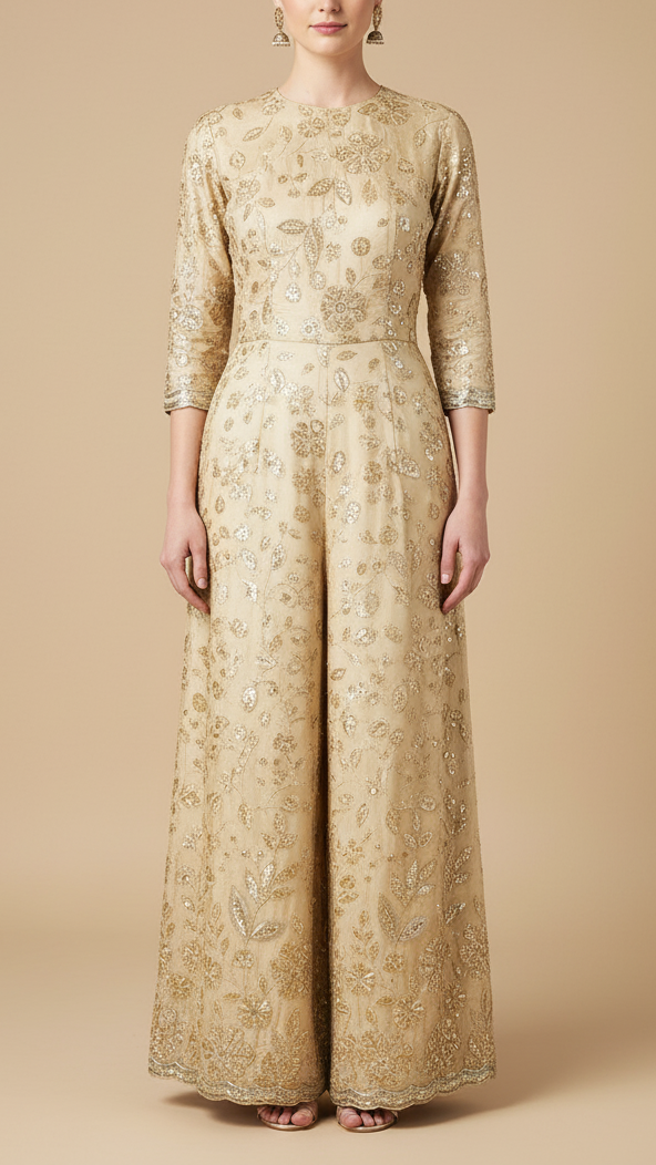 | Fabric Name | Cream Crepe Fabric With All Over Sequins, Bead And Zari With One Side Scalloped Border |