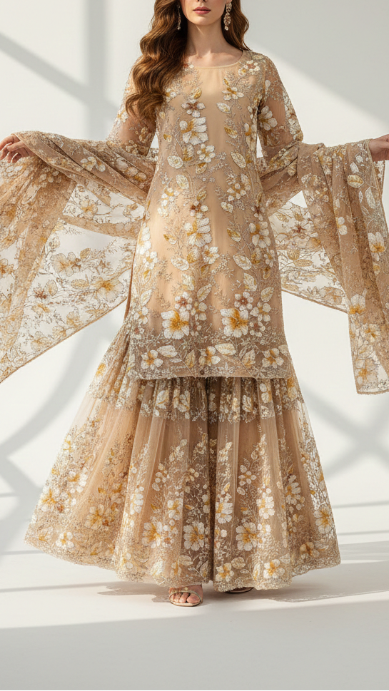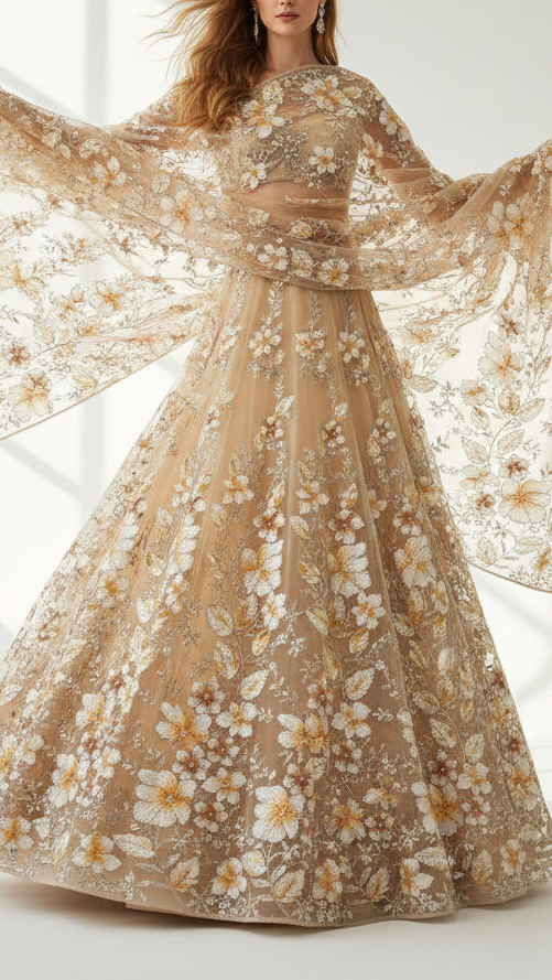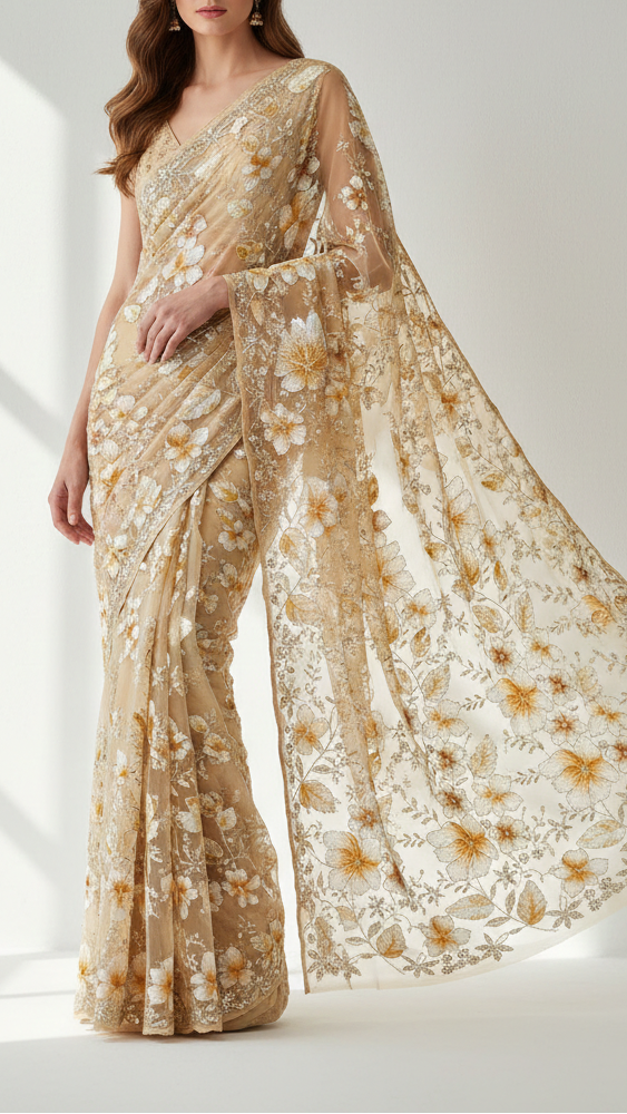| Fabric Name | Cream Imported Net Fabric With All Over Sequins, Bead, Katdana And Ribbon Work |