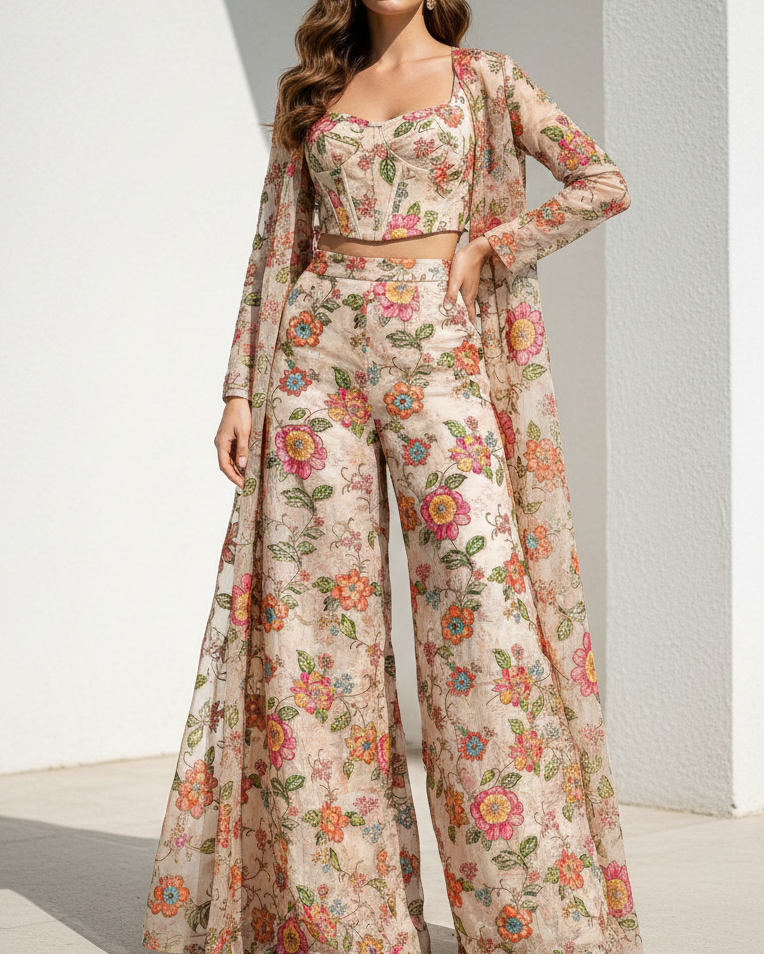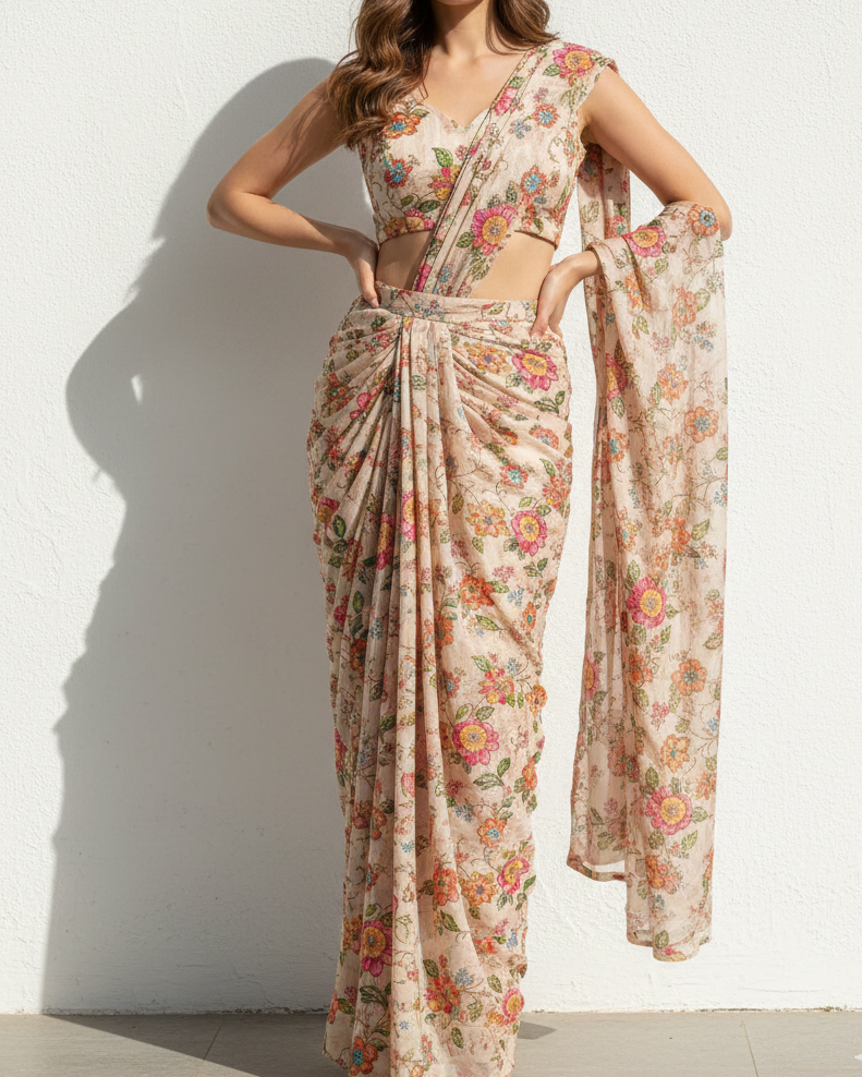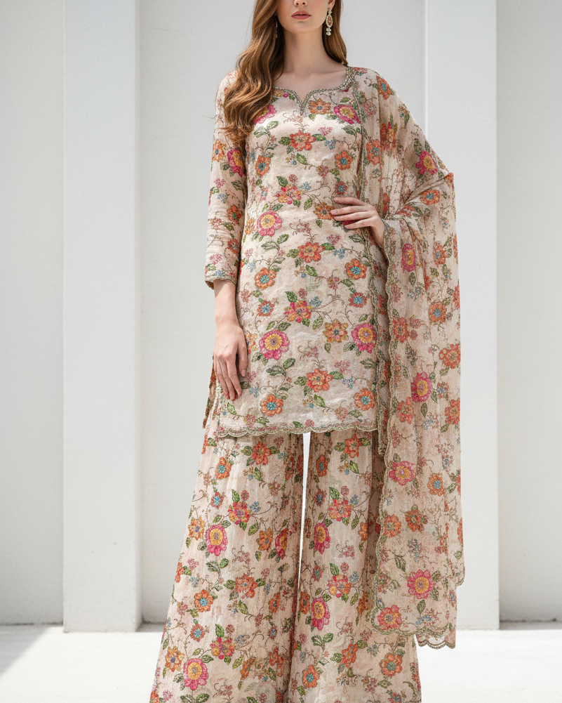 | Fabric Name | Cream Organza Fabric With All Over Traditional Print, Zari And Sequins Work |