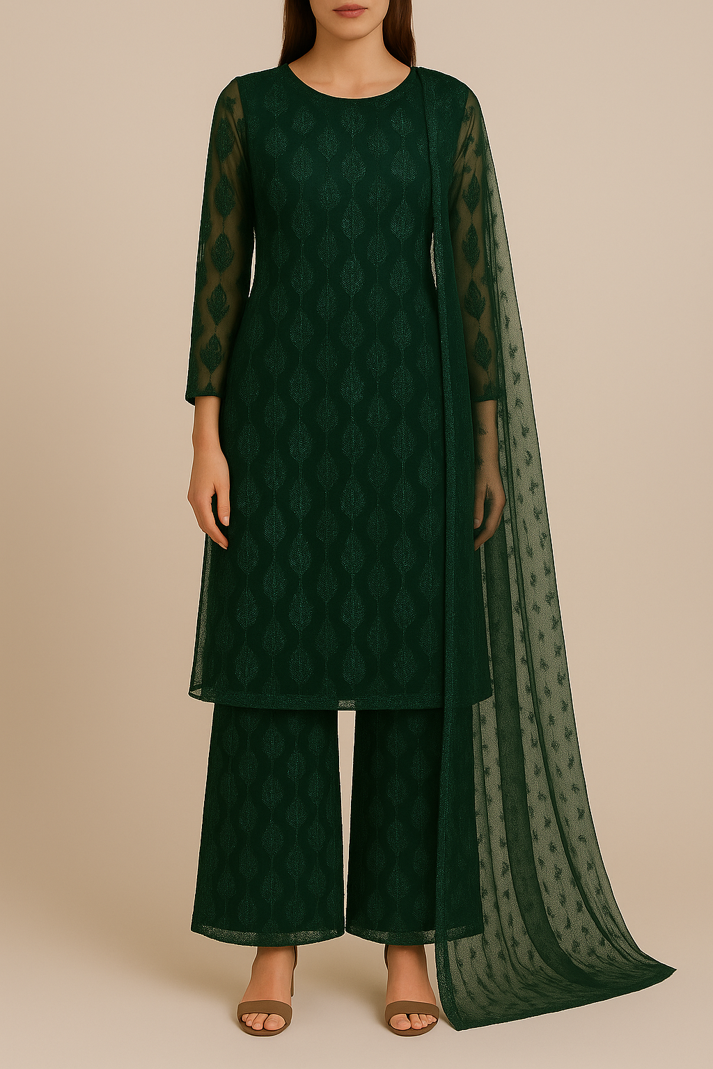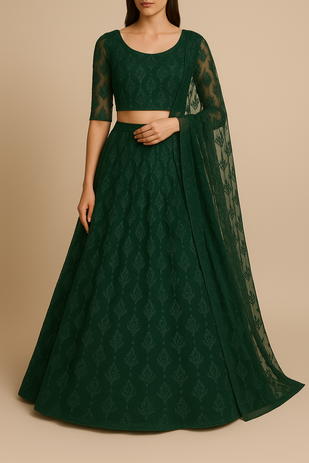 Fabric Name | Dark Green Imported Net Fabric With All Over Sequins And Bead Work |