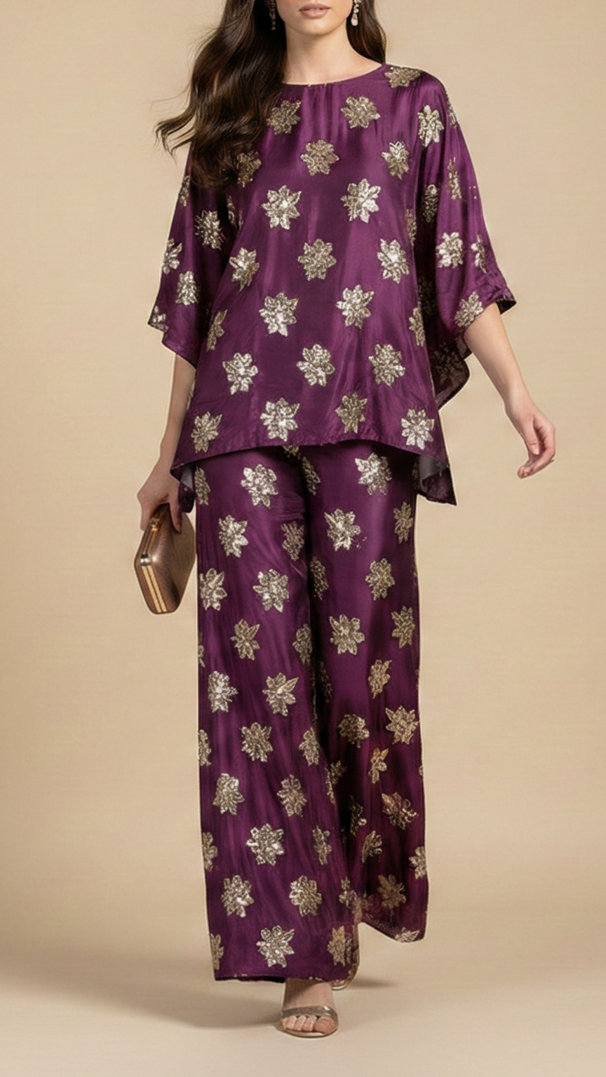 | Fabric Name | Deep Purple Silk Fabric With All Over Sequins, Bead And Katdana |