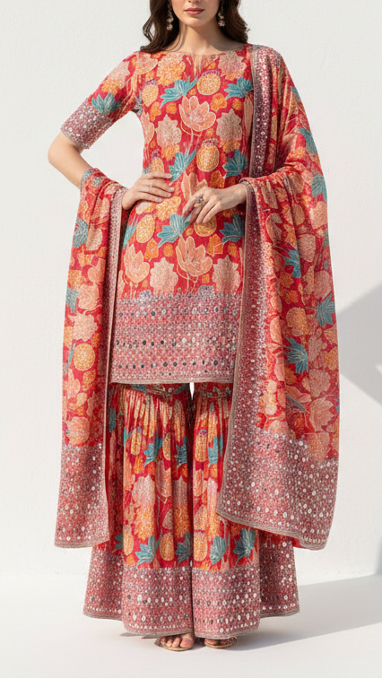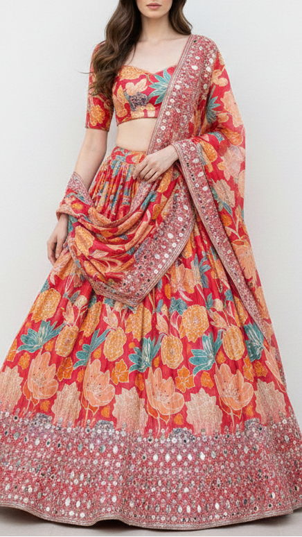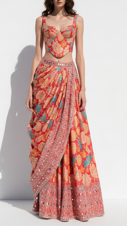 | Fabric Name | Gajri Tissue Fabric With All Over Floral Print And One Side Bead, Sequins, Zari And Faux Mirror Border |