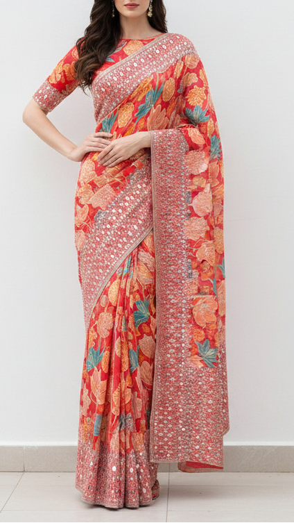 Gajri Tissue Fabric With All Over Floral Print And One Side Bead, Sequins, Zari And Faux Mirror Border 20304