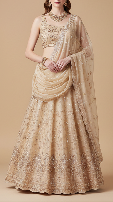 Ideal for sarees, lehengas, gowns, and dupattas, this fabric blends elegance with festive sparkle. The combination of sequins and bead work with a scalloped border makes it suitable for weddings, receptions, and celebratory occasions.