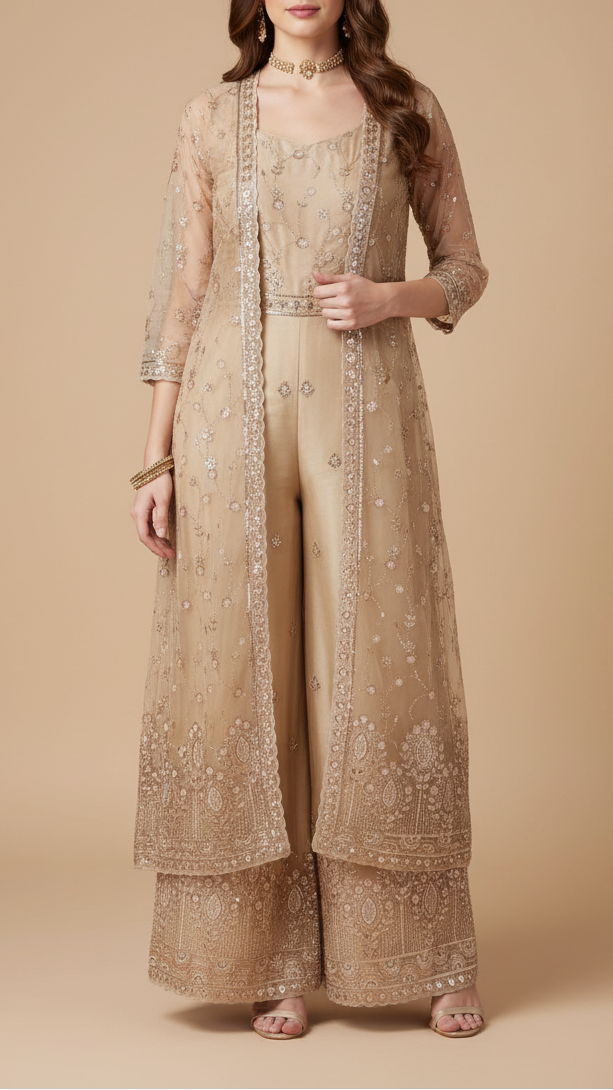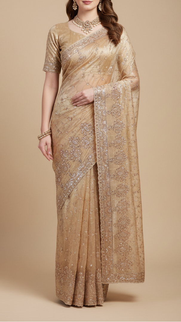 | Fabric Name | Gold Organza Satin Fabric With All Over Sequins And Bead Work With One Side Scalloped Border |